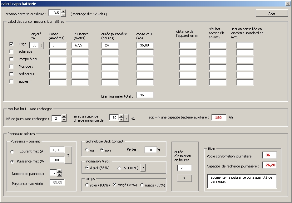 On rentre d'abord les consommations, puis on défini un nombre de jours en autonomie, et un taux de charge mini.