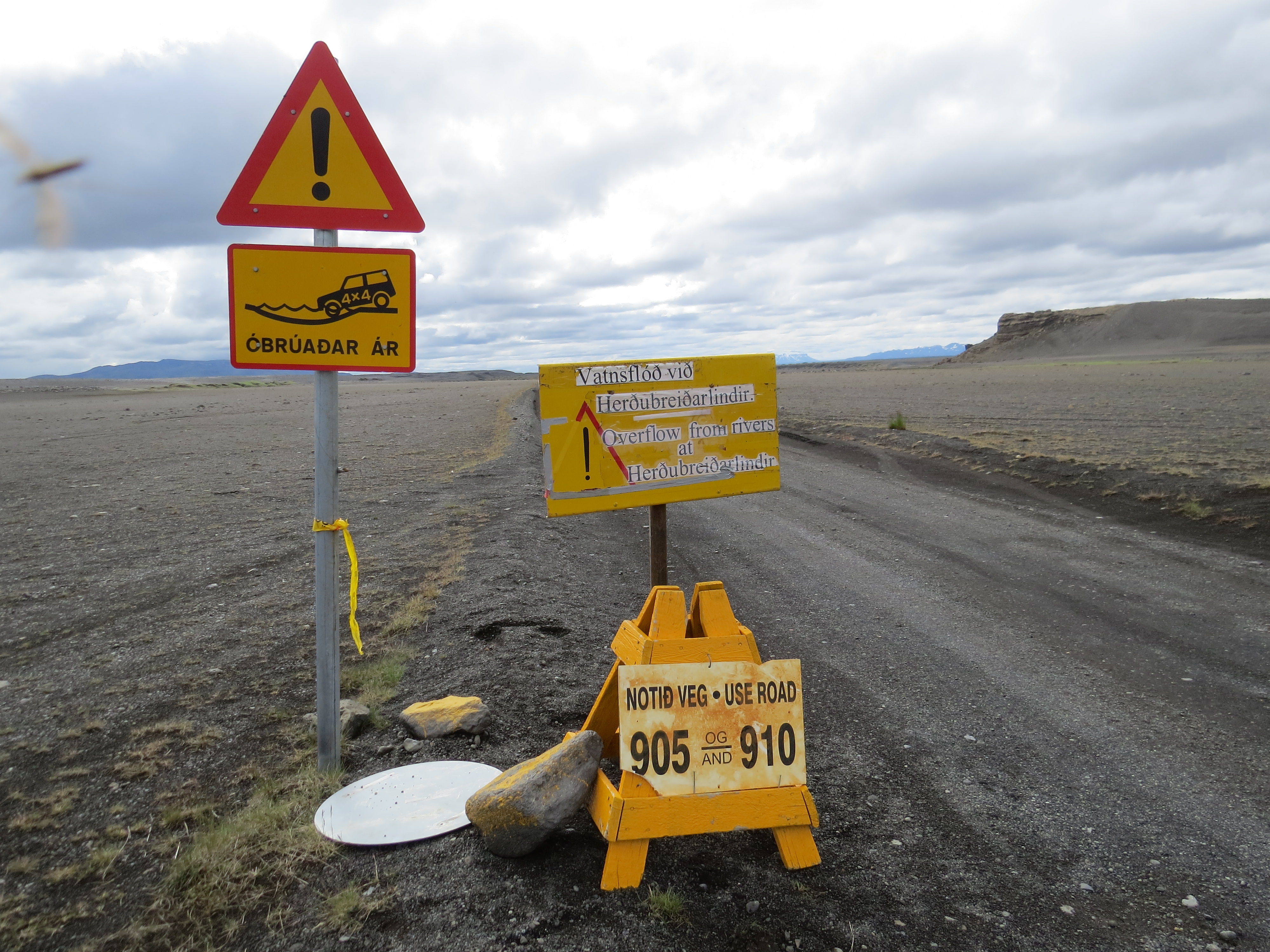 Le seul gués que nous appréhendions était Lindaa sur la F88, sur le site de la sécurité routière islandaise (http://www.safetravel.is), il était indiqué comme "challenging" et réservé aux "SuperJeep" et qu'il fallait éviter cette piste. Après s’être renseigné auprès des secouristes du 112 (safetravel), ils nous ont rassuré et dit que notre valeureux Obélix devrait passer le gués. Ce n'était pas un problème de profondeur, mais de courant et surtout un fond avec beaucoup de cailloux qui ne permettait pas d'avoir un bon grip. Dans le sens opposé, à l'entrée de la piste, il y avait ce panneau. Et effectivement, il n'y avait pas tant d'eau que cela. Par contre, au niveau du grip, on sentait bien que c'était light.