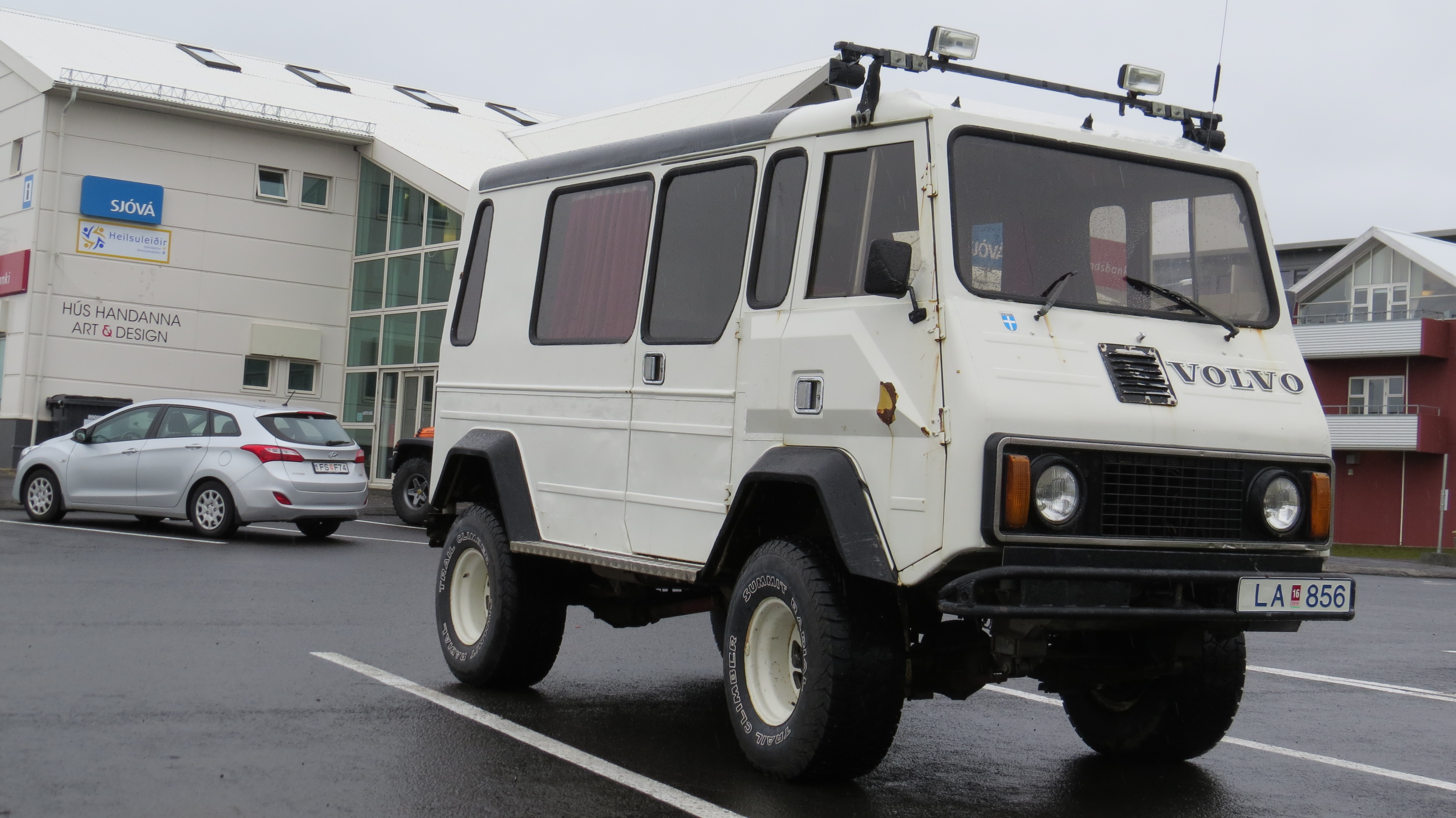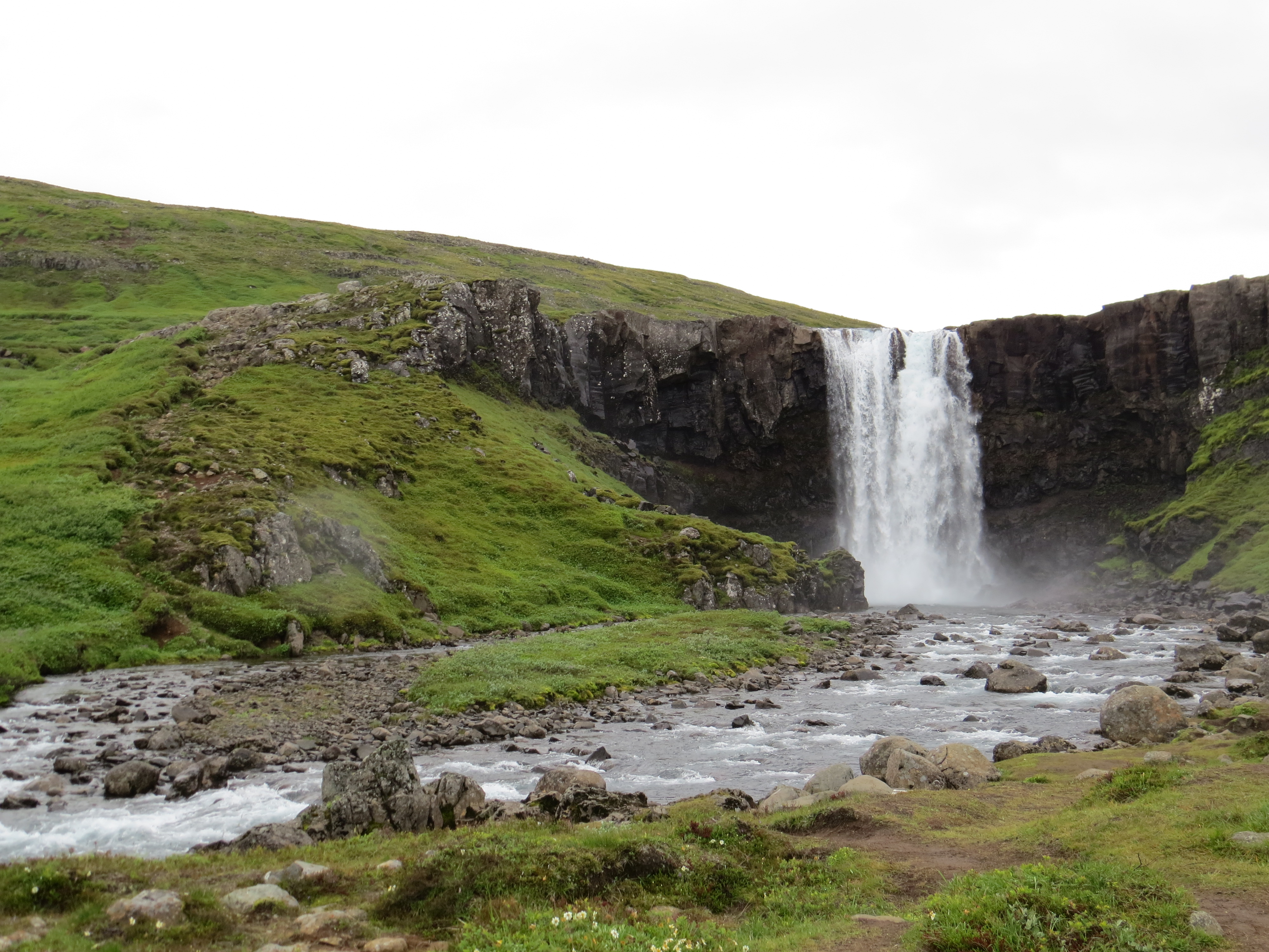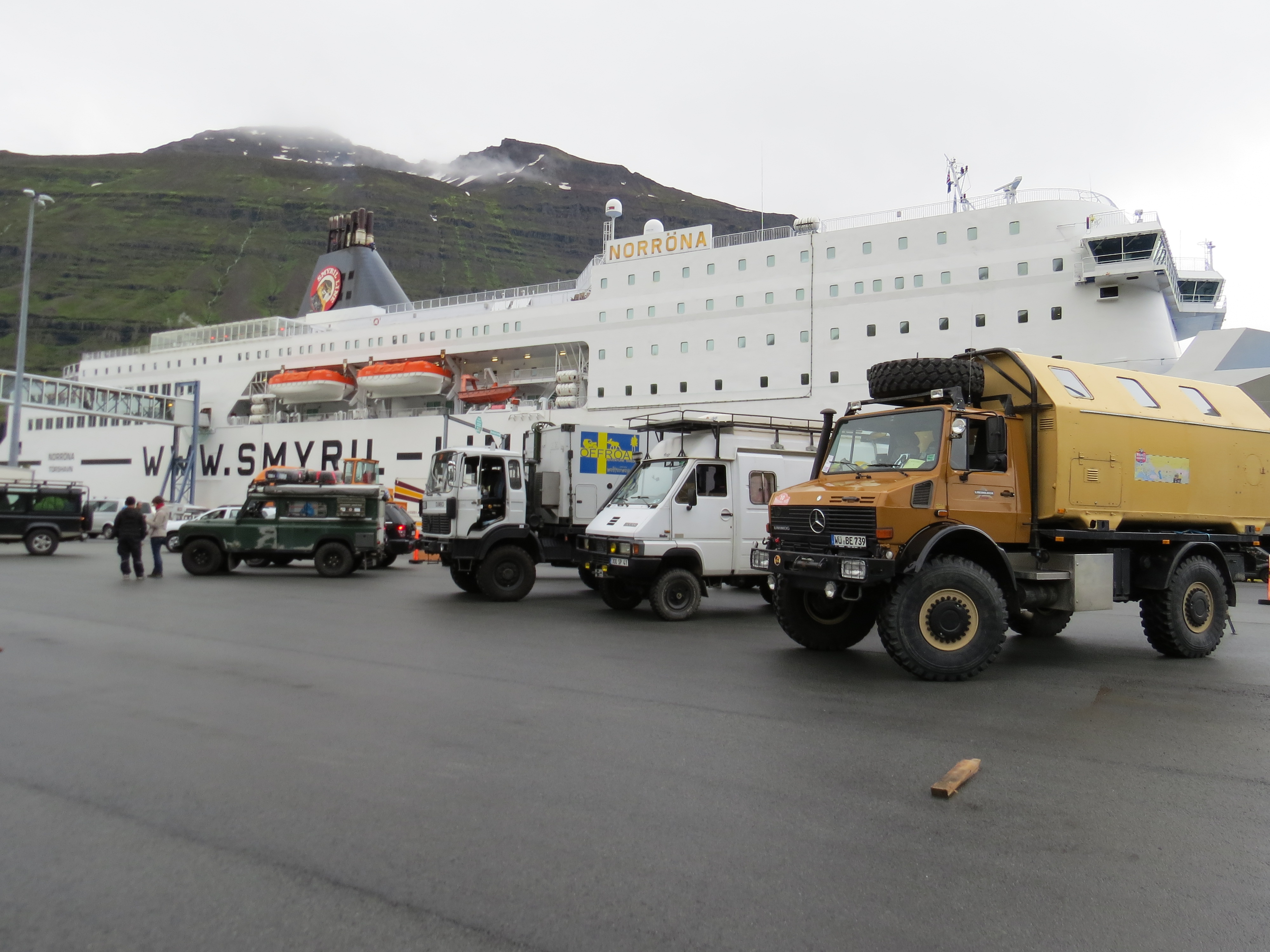 A la descente du bateau, quelques véhicules de coté pour un contrôle douanier. Et nous en faisons partie, passage du chien, et petit rappel sur la conduite offroad. Première cascade Islandaise à la sortie du village Passage d'un col, on passe du niveau de la mer à 600m d'altitude en moins de 10 km, la pente est assez raide par endroit. C'est l'heure du ravitaillement, et de l'achat d'une carte sim locale pour pouvoir suivre les alertes météo Islandaise et ne pas être couper complétement du monde. Le coût n'est pas trop important, 20 euros pour 60 mn de conversation, 100 sms et 1 Go de Data. C'est : https://www.siminn.is, il faut aller au magasin "multimédia" en face de la station N1 de Egilsstaðir Temps pas terrible, pluie/bruine, plafond très bas.