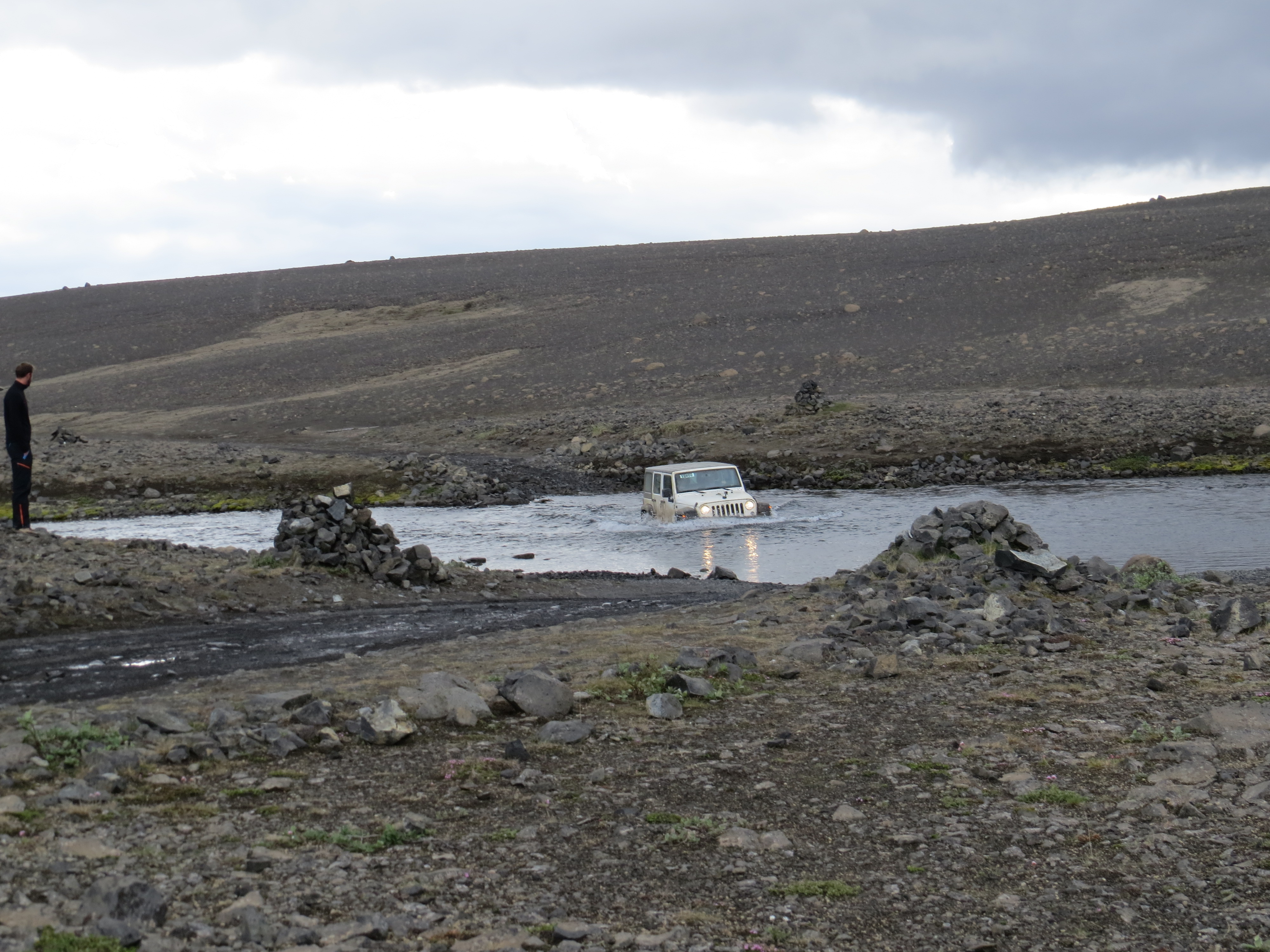 La veille, en consultant le site http://www.safetravel.is, le gués de Lindaa était indiqué comme challenging" et réservé aux "SuperJeep" . Mais s’être renseigné auprès des secouristes du 112 (safetravel), ils nous ont rassuré et dit que notre valeureux Obélix devrait passer le gués. Et effectivement, ça passait. La piste est superbe, entre zone aride et piste au milieu des champs de lave, c'est superbe.