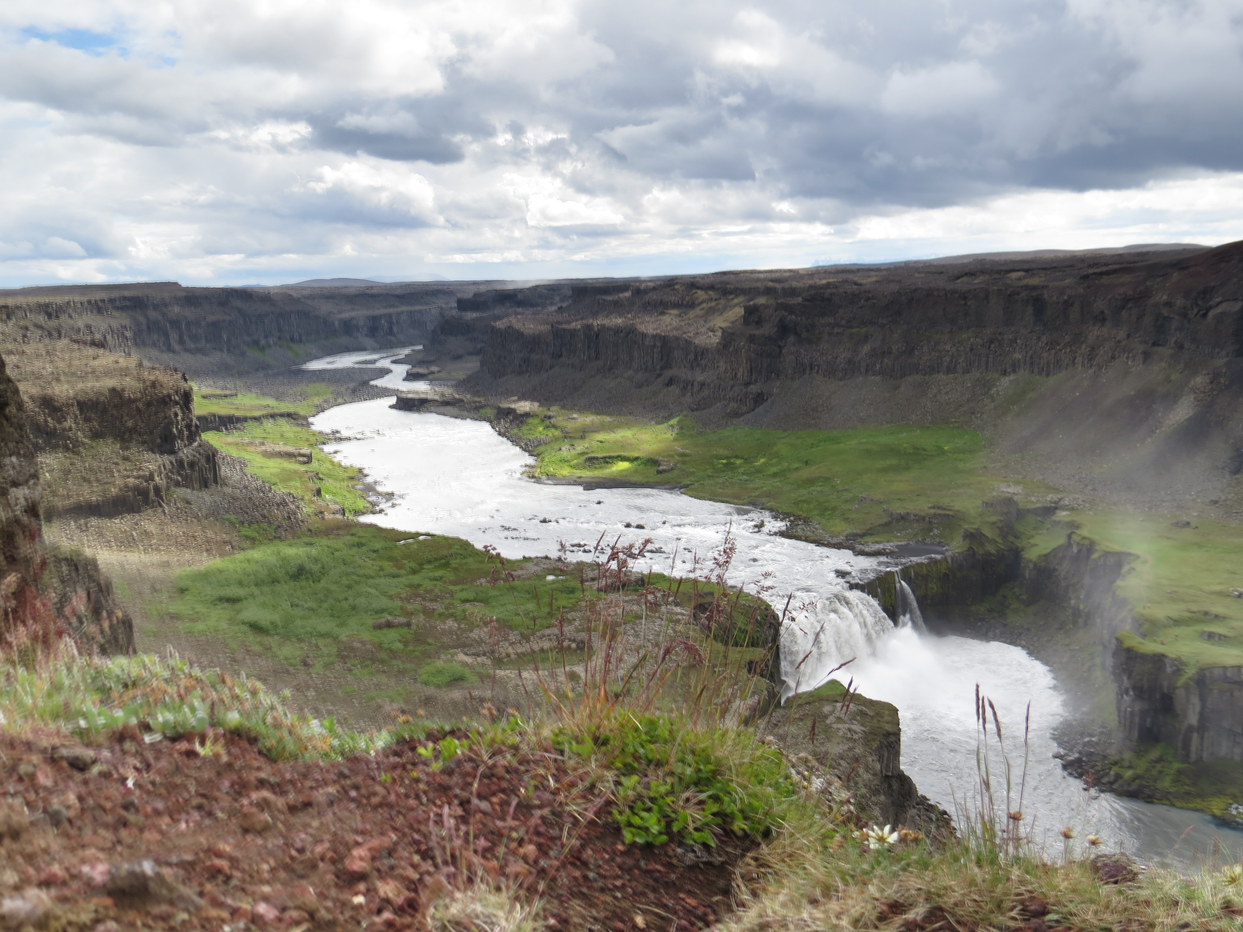 Arrivée en fin de journée au champ de Drekagil , camping obligatoire, on est dans un parc National. Temps: Légèrement couvert le matin-Soleil l’après midi-Averse en fin de journée