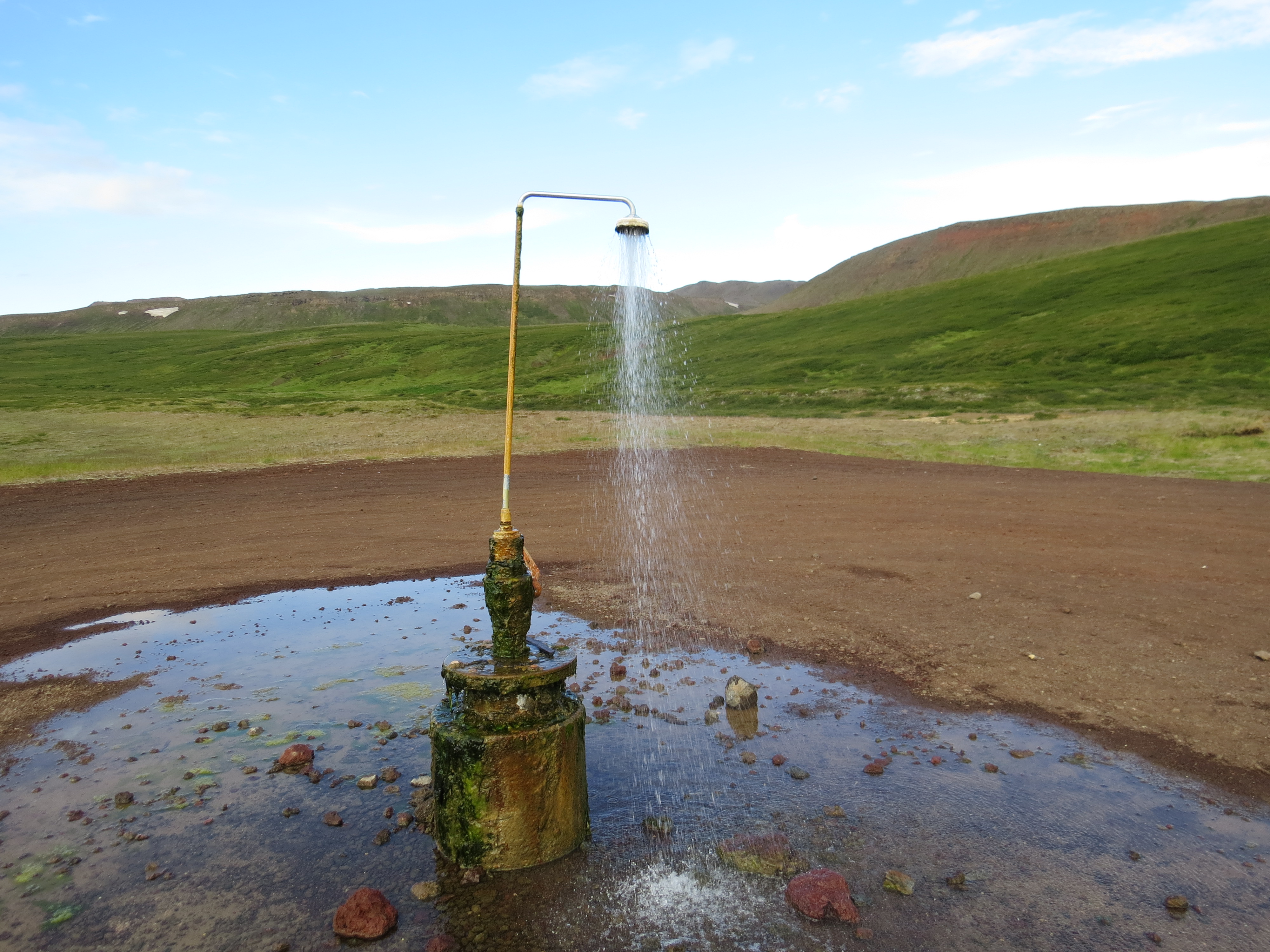 Une bonne douche en plein air Puis direction la zone volcanique d'Askja via la piste F910. C'est une piste agréable, pas cassante, on pourrait passer en 4x2, le seul soucis serait le passage des gués. On passe de zone aride, puis quelques coins de verdure, puis à nouveau une zone aride au milieu de champ de lave.