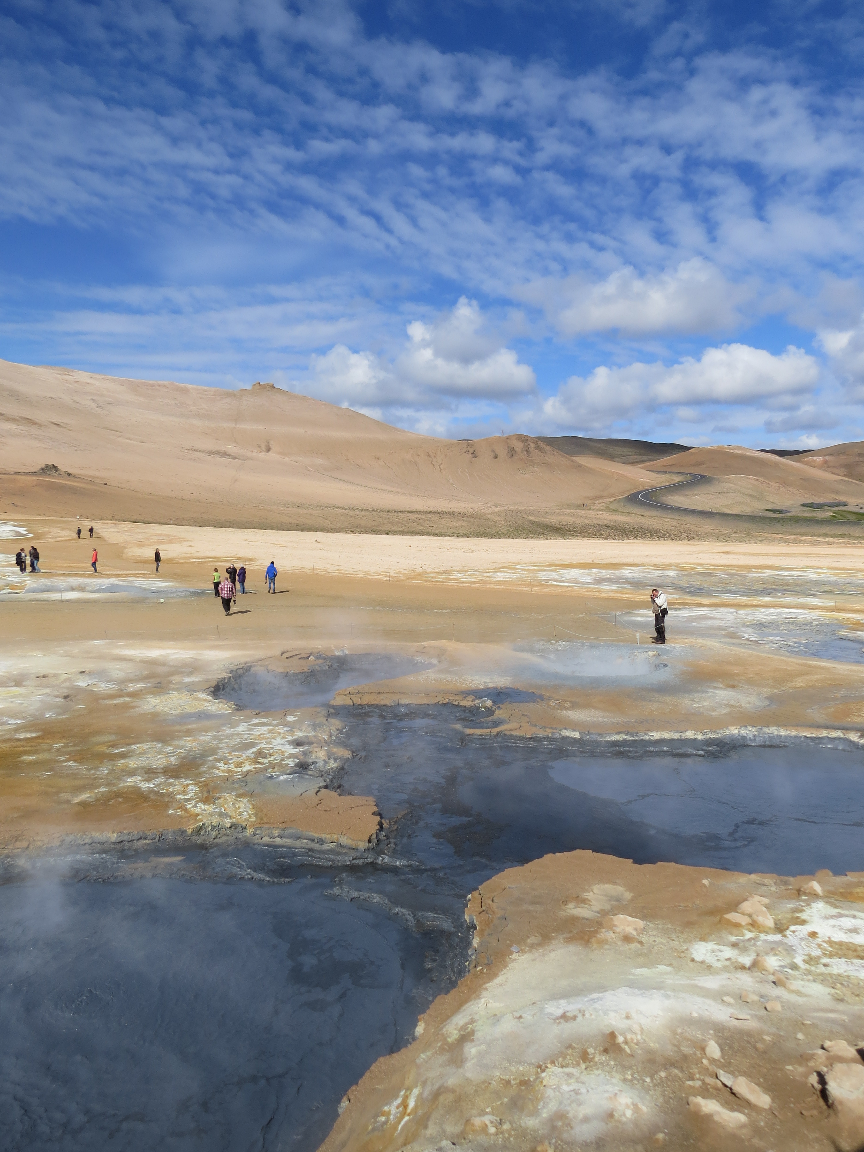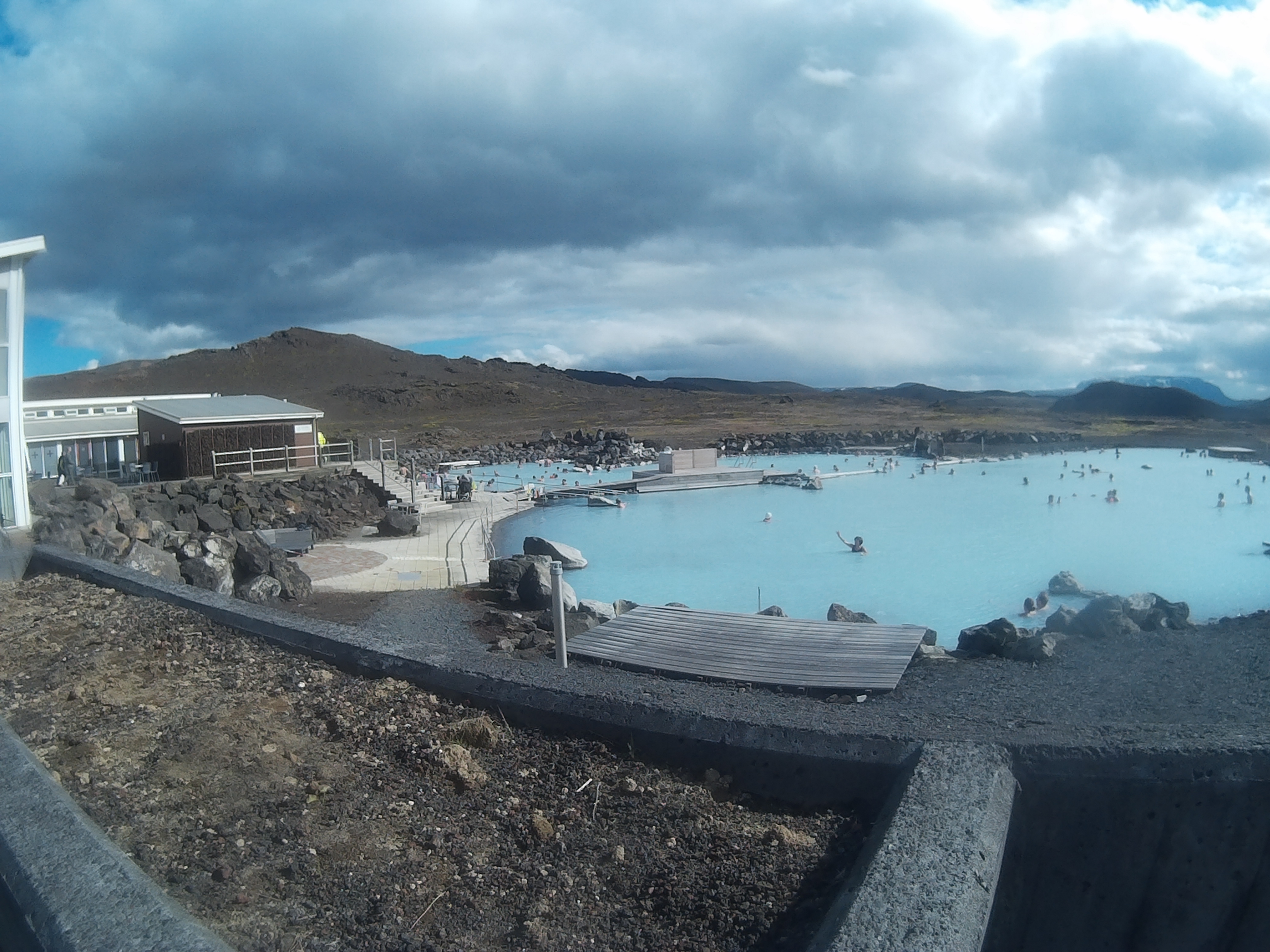 - la zone volcanique de Krafla, balade sympathique au milieu d'anciennes coulées de laves. Le site est encore actif avec des fumeroles un peu partout - des bains chauds aménagés avec une eau bleu et légèrement laiteuse. C'est le Lagon Bleu de Reykjavík en plus petit avec beaucoup moins de monde mais surtout beaucoup moins cher - de la zone de Leirhnjúkur , avec ses marmites boueuses, ses fumeroles, et surtout de son odeur - du lac avec ses nombreux oiseaux