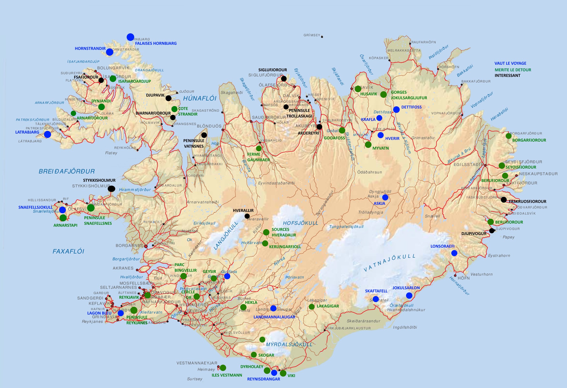 Un petit merci, un retour d’expérience serait le bien venu. Rien de plus simple, il suffit de s'inscrire sur le Forum Ci-dessous quelques fichiers pour préparer ou voyager en Islande. Quelques parcours de "tour Opérateur" et de "particuliers". Chaque couleur correspond à un jour