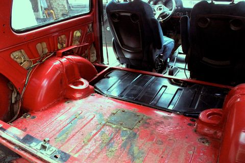 Il a fallut retirer une grosse planche d'aggloméré qui faisait tout l'arrière puisque pas de banquette. Planche degueu sur laquelle était fixée une caisse... Pas de photo... La plaque métallique amovible au-dessus du réservoir était bien rouillée mais après ponçage et anti rouille elle est nickel et repeinte (en rouge anti-rouille