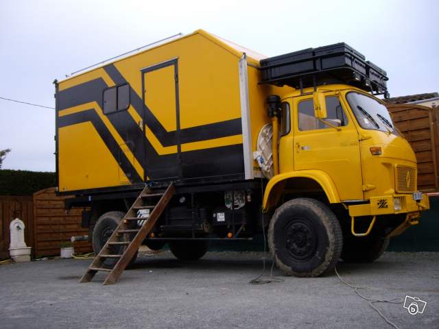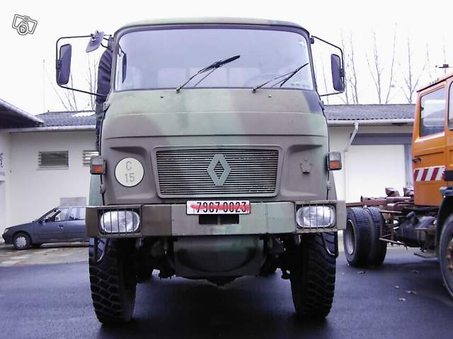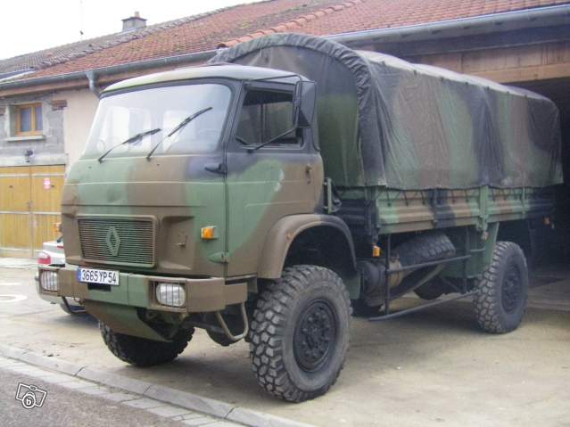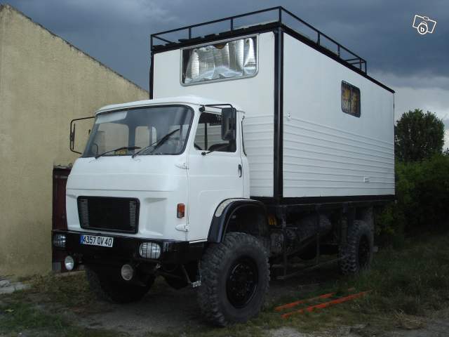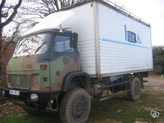 Vends Renault SAVIEM TRM 4000 de 1981, camion de l'armée Française 4X4, 70 000 kms, ammenagé : douche, emplacement wc, cuisine, lit 2 places, cuve d'eau 500L, chauffe-eau, 2 feux gazinière, frigo neuf 12/220V/gaz, panneau solaire 70W, salon, nombreux rangements, 2 roues de secours, 2 grilles de désensablage, intérieur bois (lambris),barres anti encastrement arrière amovible, galerie, auvent neuf pas installé, bouteille d'air neuve, 2 batteries neuves, nbreuses facture à l'appui.