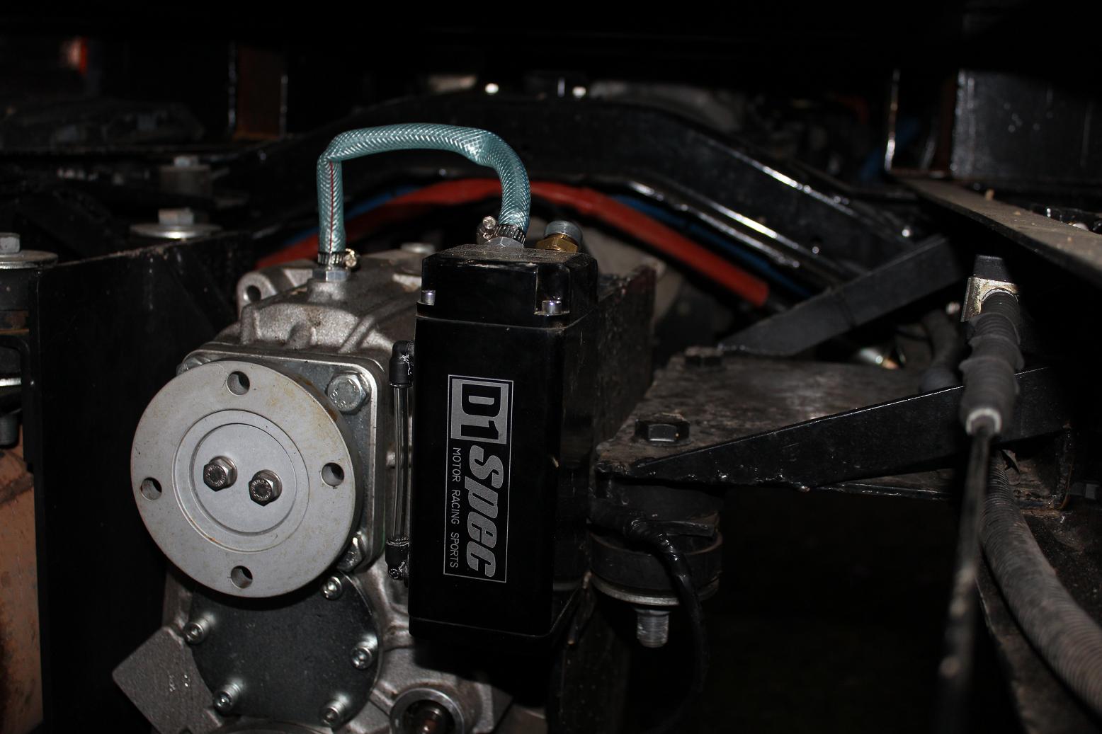 J'ai installé un "oil catcher" à la sortie de la boite de transfert. En effet, celle ci était équipée d'une petite soupape de décharge, mais j'avais en permanence de l'huile qui coulait par cette soupape (bien que le niveau d'huile soit bon). Du coup ça coulait sur l'arbre de transmission, et ça arrosait au large (pot, pont, châssis, et même derrière la cabine).