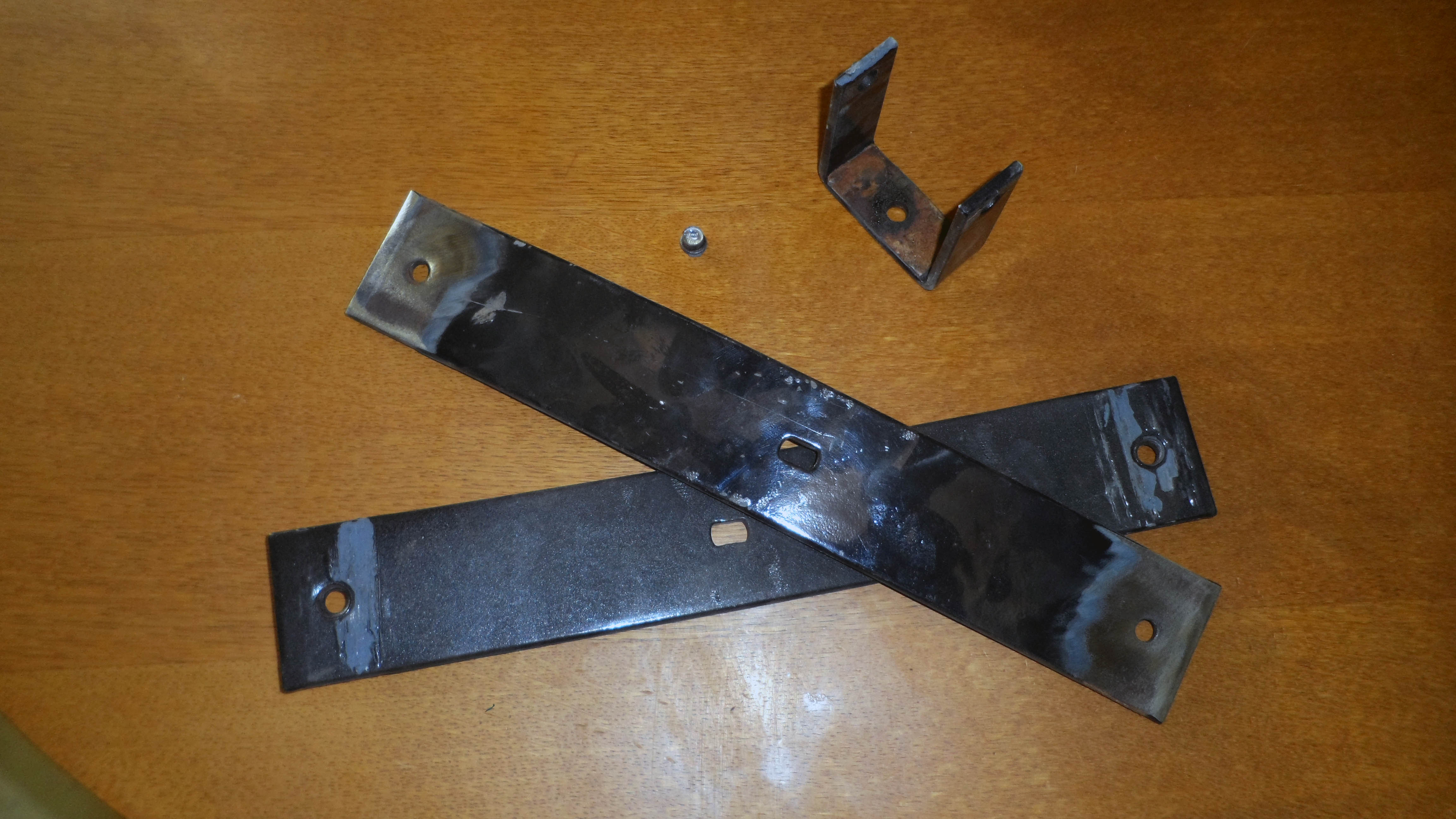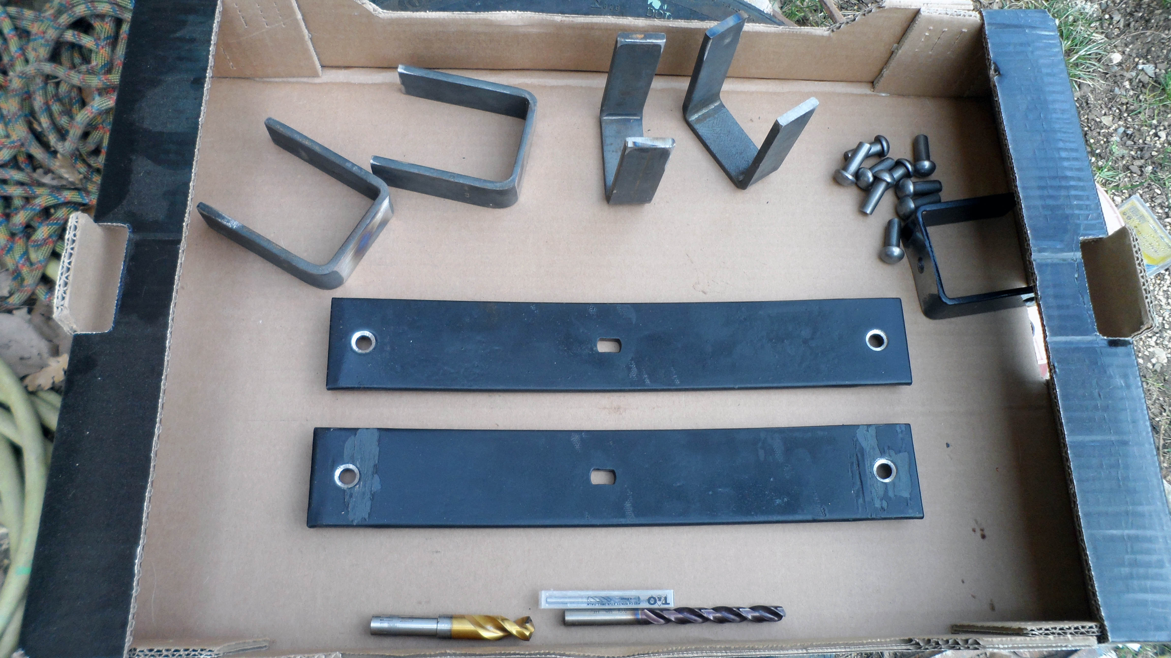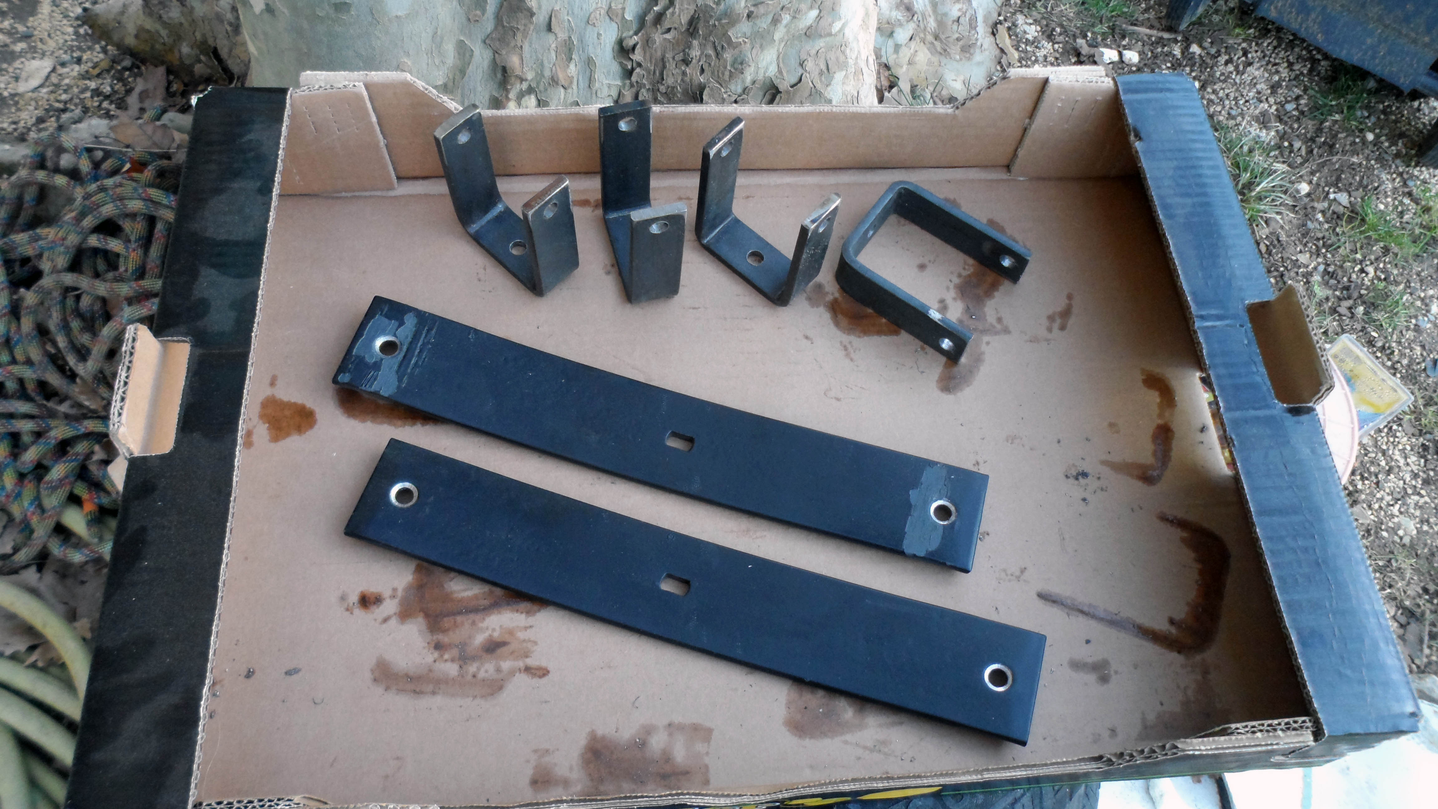 Dans l'optique d'ajouter deux lames supplémentaires à l'avant, je me suis découpé des languettes de métal que j'ai fait plier par un ami ferronnier. Ces "u" serviront à remplacer les liens rivetés sur les lames inférieures de mes paquet à l'avant.