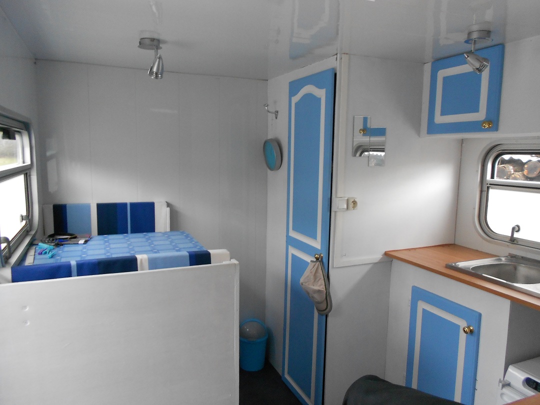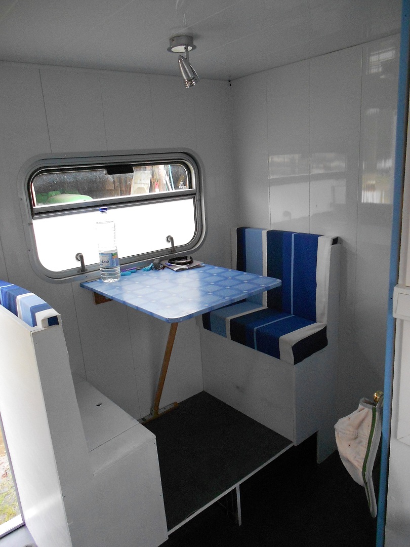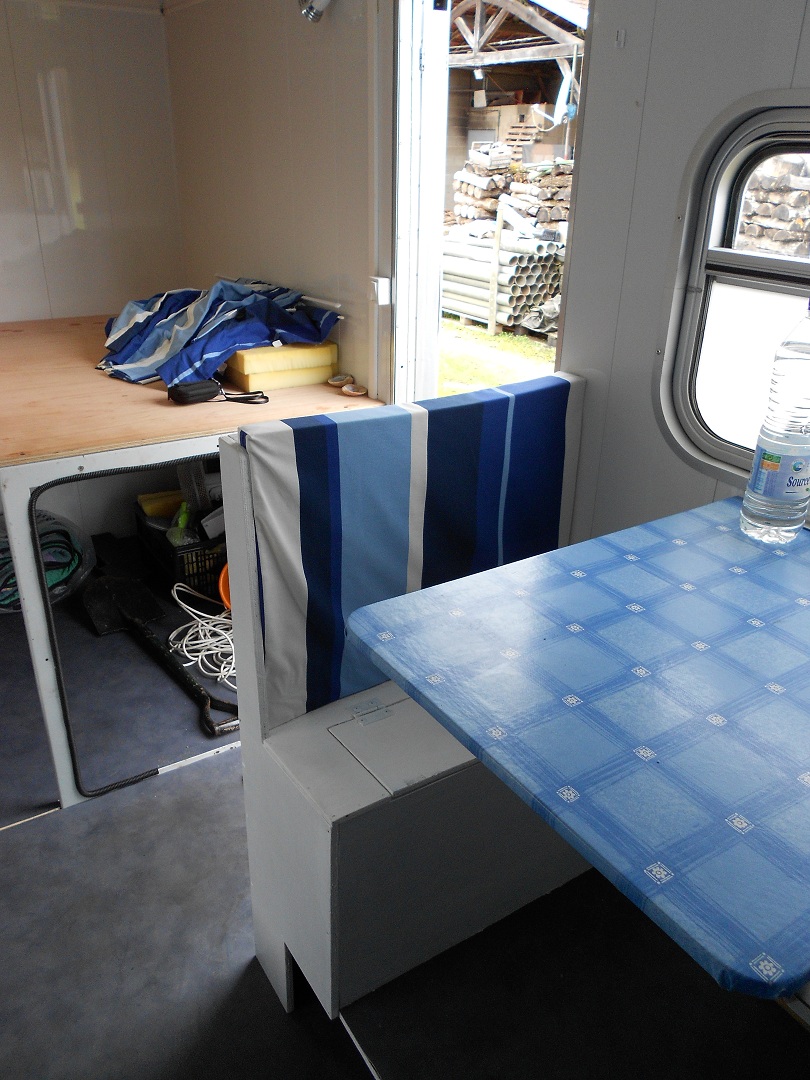 - Un coin table 2 places sur coffre (sous les assises) + grand coffre tout le long sous l'ensemble table. La table peut se replier pour gagner de la place pendant le voyage.