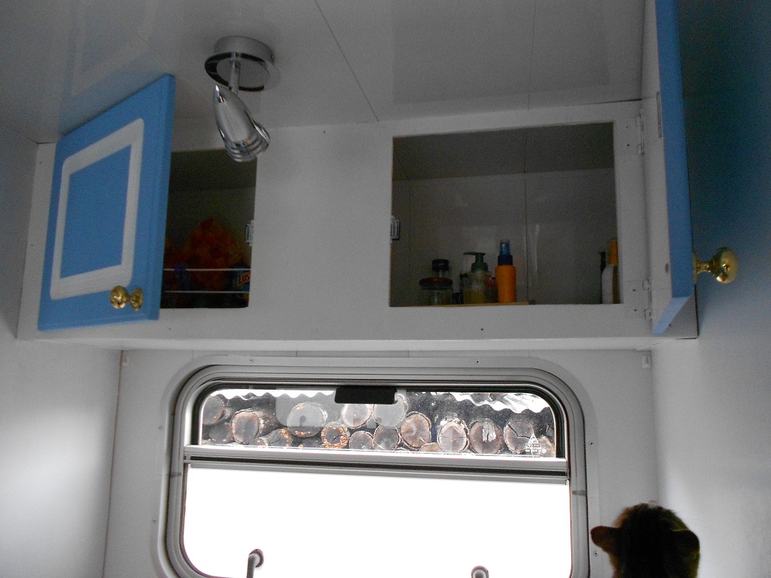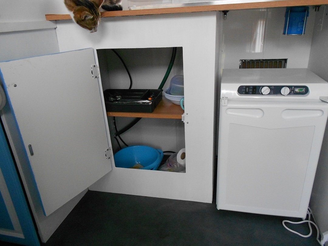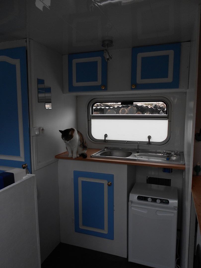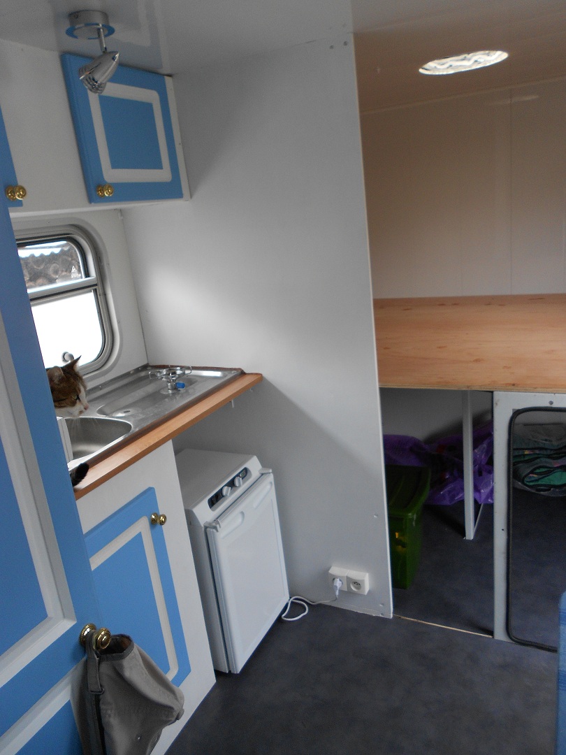 - Un coin cuisine avec évier sur plan de travail + 2 bruleurs type "camping gaz". Ca évite de transporter une grande bouteille de gaz, et c'est largement suffisant. Je les ai implanté dans les emplacement feux de l'évier, comme ca ils ne bougent pas. Au dessus, une fenêtre (type ambulance) et au dessus un meuble avec 2 portes pour rangements. En dessous coté gauche un meuble avec grande porte, et coté droit un "vide" pour y rentrer le frigo. Une bouche de ventilation est présente derrière l'emplacement frigo.