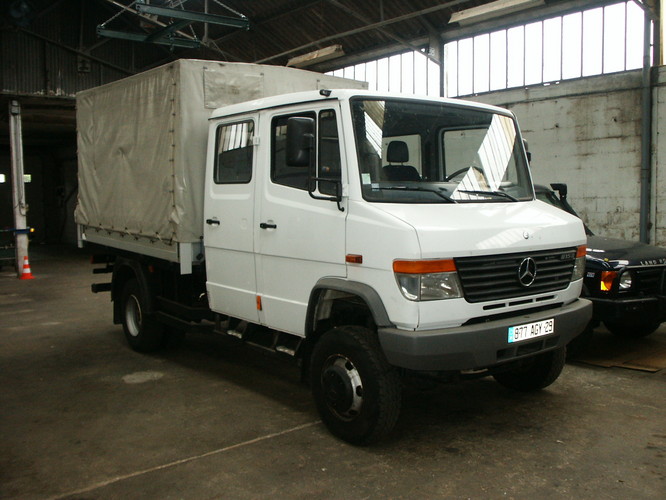 Vario 815DA 1999, 115000kms, 7t5, transmission 4x4, moteur OM904LA 153ch - 11ch fiscal, double cabine 7 places, plateau Kögel 3150x2320, empattement 3700, boite de transfert avec réduction et blocages différentiels pneumatiques, freins à disques (oléopneumatique) avec ABS, roues jumelées AR 9,5x17,5.
