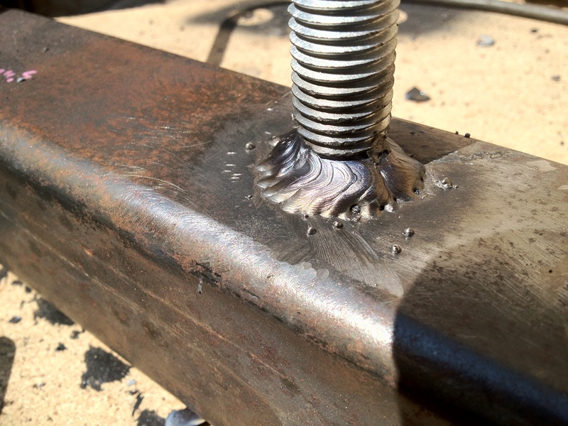 Je te conseille donc des goujons à filetage partiel. Percer le tube carré de part en part, souder complètement le bout du goujon sur l'AR du tube carré et juste deux ou trois points devant pour ne pas détremper le goujon.