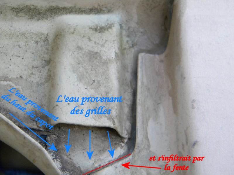 Mais plein de courage, je démonte le côté droit et je vois qu'il a déjà été réparé à la choucroute. Un défaut des cabines de B ? L'eau coule dans le triangle que l'on voit en bas de la gouttière. J'ai bouché ce triangle, pensant que la "ventilation" de cet endroit serait suffisante par l'espace non hermétique entre les 2 tôles soudées par points.