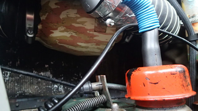 Hormis des problèmes de raccords grippés (sur 2 raccords, je me suis résigné à couper la canalisation puis refaire des collé-battus), l'hydrovac adaptable a nécessité quelque modifications(fixation sur châssis + un raccord en T à la sortie de l'hydrovac au lieu du raccord banjo d'origine).Le plus difficile a été de purger le circuit ,au début impossible d'amorcer le maitre-cylindre puis ensuite pédale toujours molle jusqu'au plancher en utilisant la méthode de la pédale comme celle de mettre en pression le circuit par le bocal(0,7 bar environ via un bouchon bricolé avec une valve).Aprés conseils pris de part et d'autre , j'ai approché au contact les garnitures au contact des tambours(avec les excentriques) puis j'ai purgé en désserant la plupart des raccords(sauf ceux trop grippés) du circuit et notamment à la sortie de l'hydrovac et du maitre cylindre , cela a bien fonctionné. 3 - Modifications pour améliorer la ventilation du compartiment moteur: