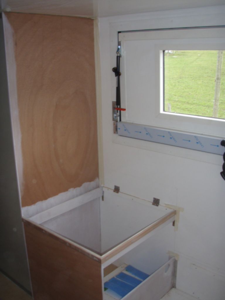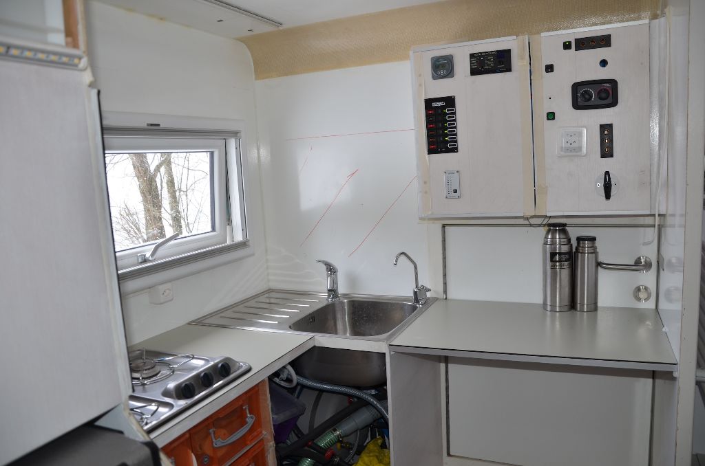 Pour l'eau, ce sera un réservoir de 150l et un autre de 100l. 60 litre d'eaux grises sous l'évier dans la cellule et 35 l sous la douche à l'extérieur.