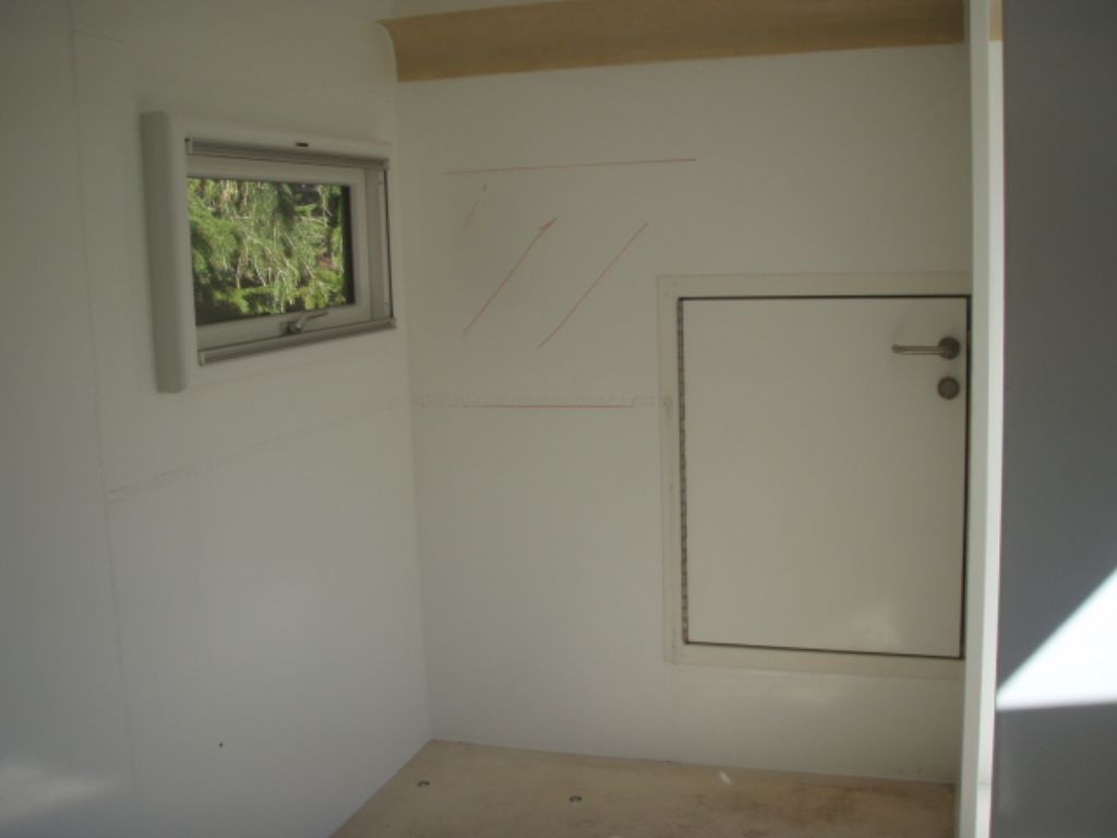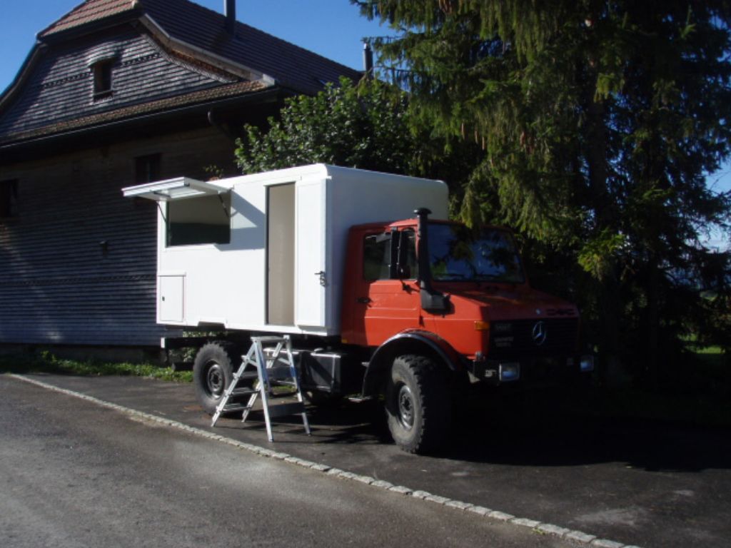 En version pompier, c'était bien pour les vacances. Pour y vivre plusieurs années, il fallait mieux. On est allé porté l'Unimog en mai, début août, ils avaient pris beaucoup de retard. Finalement, en octobre, Ursul nous attend en Allemagne et on le ramène en Gruyère On est bien fier de la fenêtre panoramique dans la partie séjour à l'arrière. La cuisine sera aménagée dans le coin avant gauche, près du passage vers la cabine Après tant de mois a faire des plans, le travail sérieux peut commencer La menuiserie commence dans la partie séjour à l'arrière qui sert aussi de salle à manger et de chambre à coucher. Le placard sépare le séjour de la section vestiaire/douche/WC La porte coulissante ferme soit le vestiaire, soit le placard L'armoire électrique prend forme au dessus de la porte du passage vers la cabine