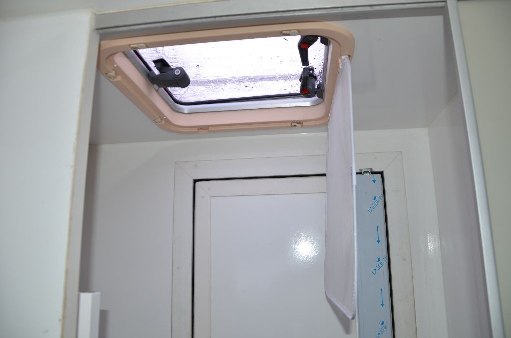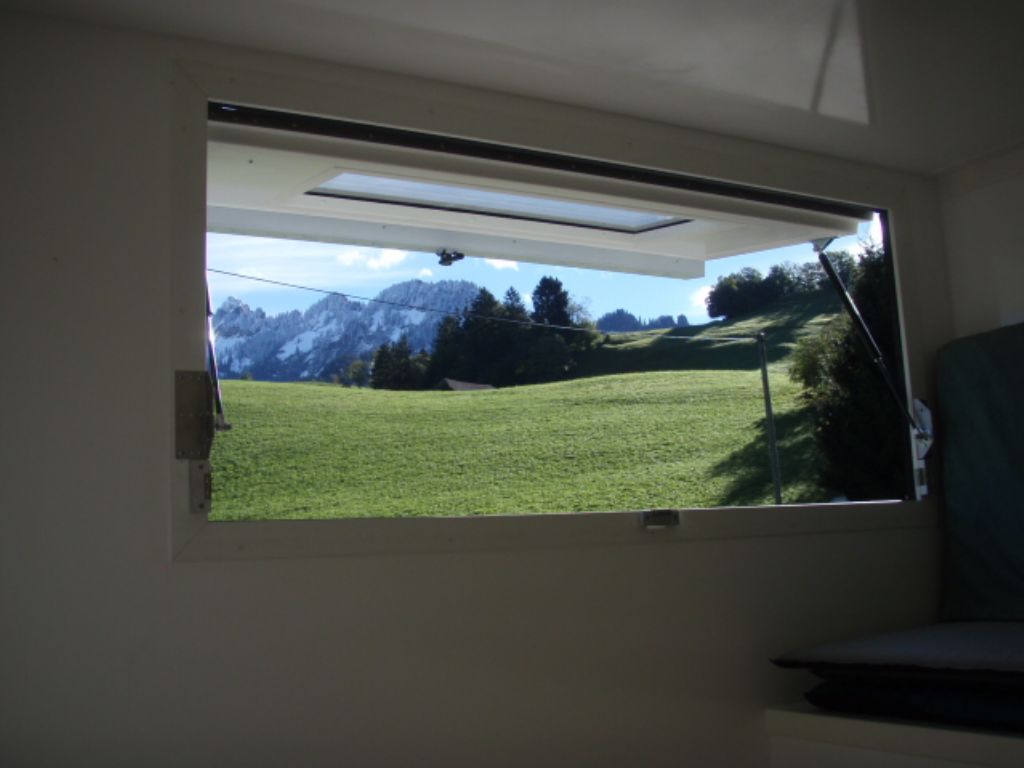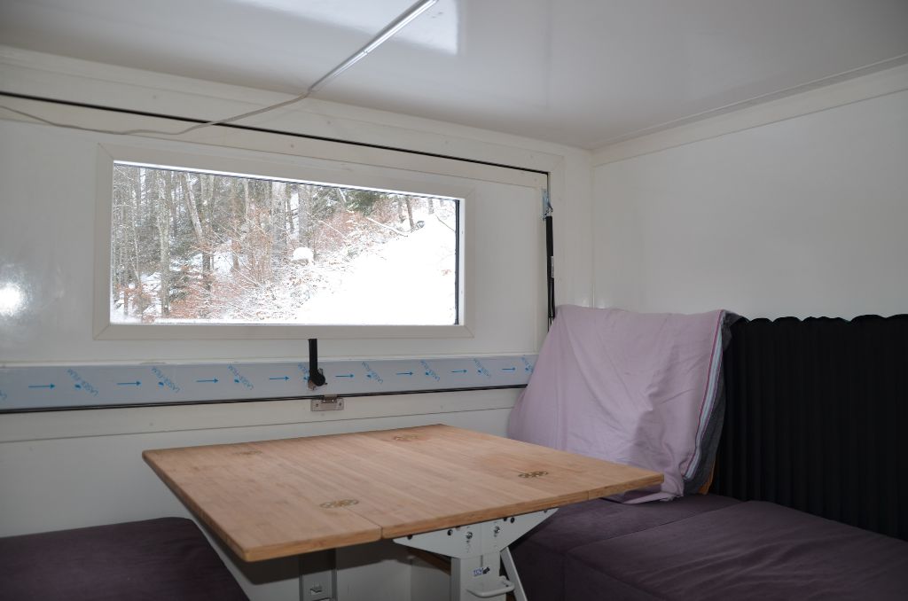 Un lanterneau de bateau lewmar permet l'éclairage et la ventilation. Mais comme c'est du simple vitrage acrylique, par temps froid, on utilise le coussin de la banquette pour isoler Pour le moment, ça nous permet de passer de beaux week-ends en Gruyère