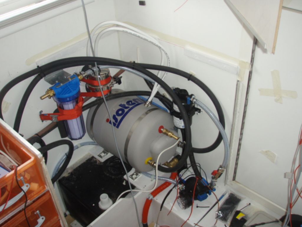 Sous l'évier, il y a la pompe jabsco et le petit réservoir d'expansion, le boiler webasto 15 litres, le réservoir d'eau grise de 60 litres