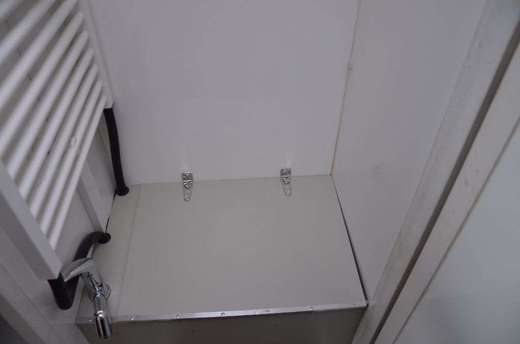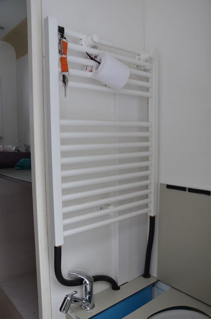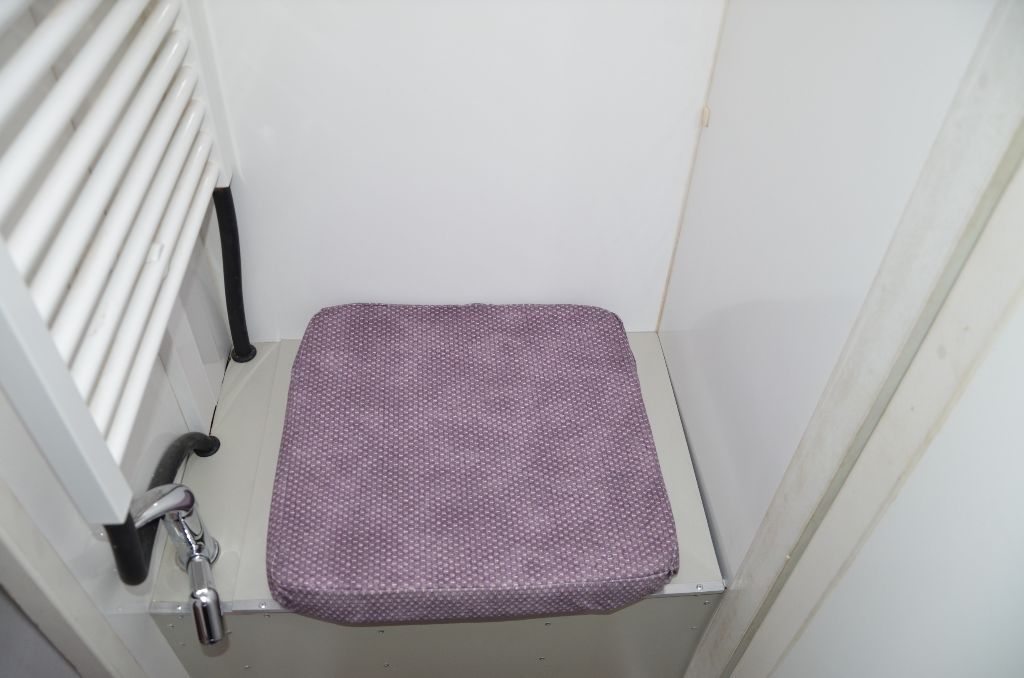 La banquette cache la toilette sèche la pièce est chauffée par le radiateur sèche-serviette. On pourra avoir une pièce sèche-linge en roulant.
