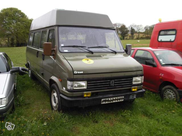 Vends J5 Peugeot, type 290G54, 4x4 permanent, plateau bâché, 4 portes, 6 places, banquette arrière escamotable. 70 000Kms non garantis. Véhicule de l'armée acheté aux Domaines.