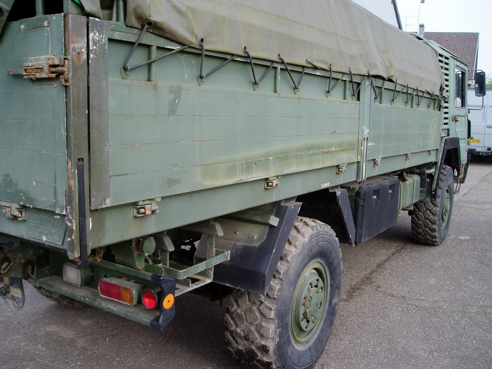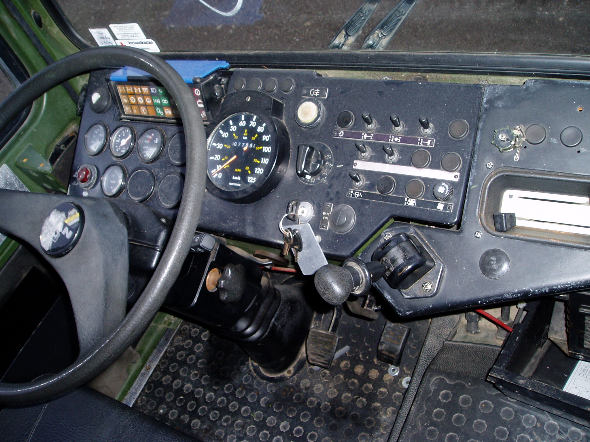 Donc, il faut que j'y retourne après avoir changer une main d'air a l’arrière qui a une petite fuite, il faut que je mette des feux de gabarits orange sur les cotés avec maxi 3 mètres entre chaque feux et que je change le commodo des lumières. Comme c'est un ex-armée il a une position éclairage incognito c'est a dire une lumière a chaque coin qui éclaire encore moins bien qu'une allumette, histoire de ne pas ce faire repérer par l'ennemi sauf que quand tu allume cette éclairage il coupe aussi le klaxon, logique. A oui et il me refuse le droit de tracter une remorque avec cette attelage, il est spécifique a l'armée, sauf si je met un attelage du style rockinger ou mg.Ce qu'il faut savoir aussi avec le ct allemand c'est que tout est noter sur la carte grise des que tu change quelque chose sur ton véhicule comme par exemple ton crochet d'attelage ou la dimension de tes pneus il faut obligatoirement que tu repasse par la case CT , mais je vous rassure il ne vérifie que la chose que vous avez changer.
