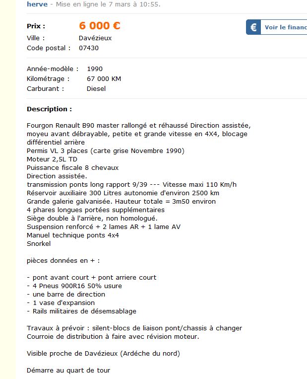 Ce camion était en vente quand j'ai acheté le mien (à cette époque il n'y avait que 2 B90/110 4x4 à vendre sur toute la France !)