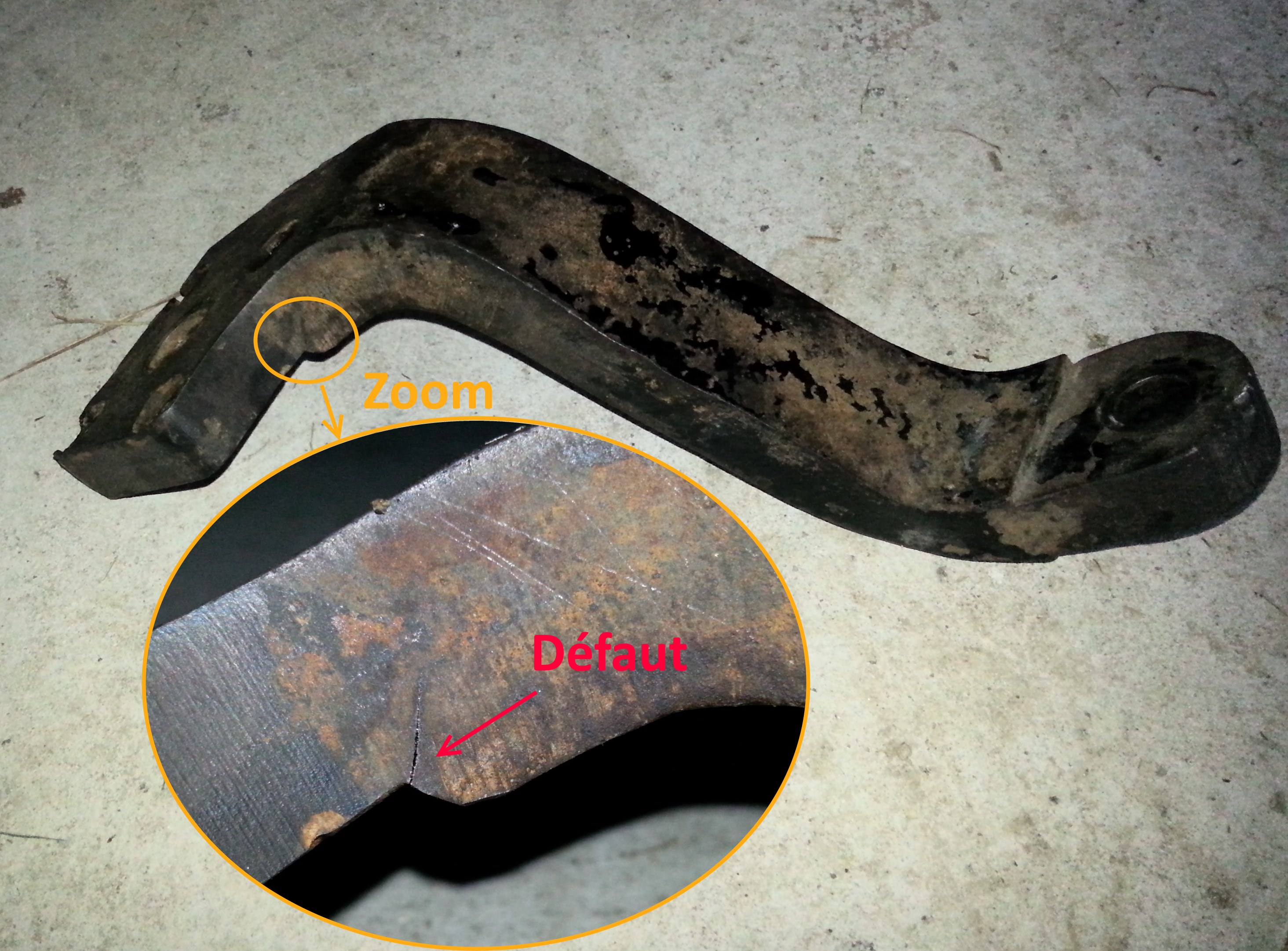 La conception de cette pièce fait qu'elle subit un effort de flexion important vu le bras de levier qu'elle constitue. Il faut rajouter à ça, un coup de fraiseuse pour créer une surface plane qui laisse une épaisseur de métal amoindrie mais surtout une belle rainure au mauvais endroit, amorce de cassure évidente, le tout devrait figurer dans les manuels pour expliquer ce qu'il ne faut jamais faire !