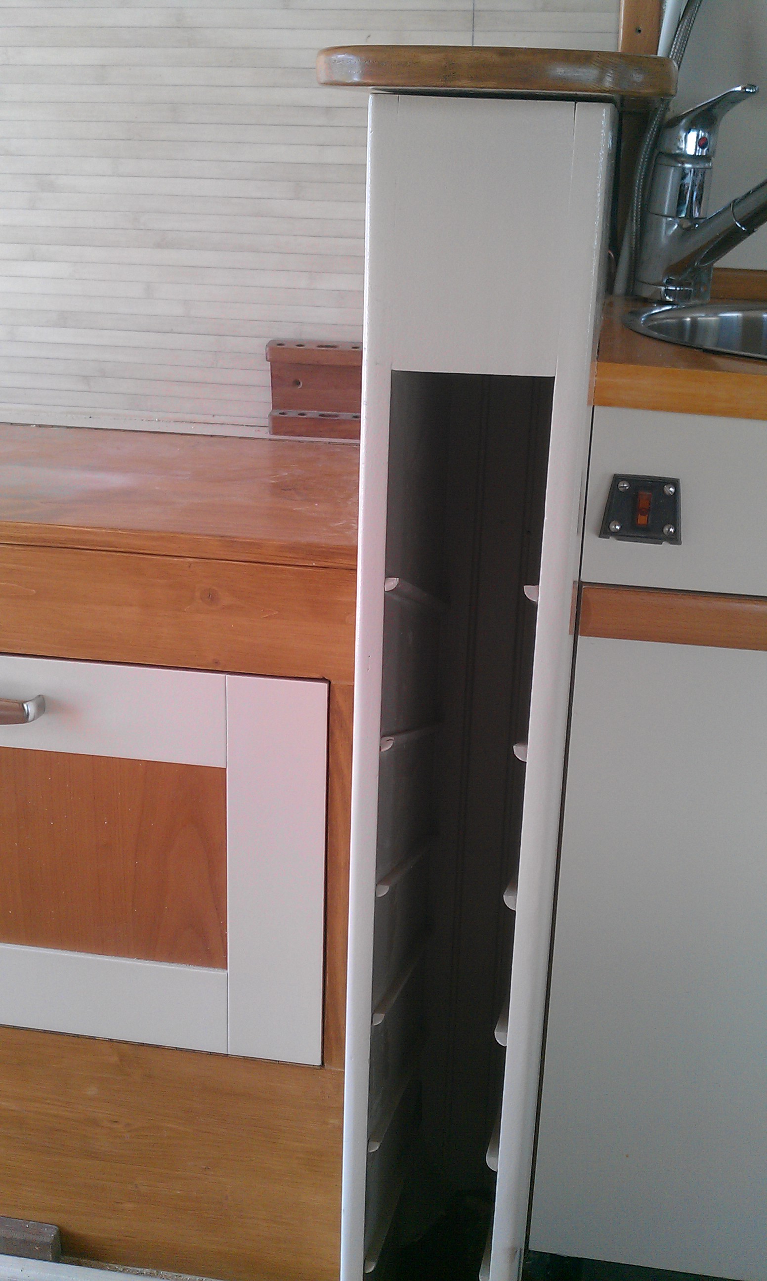 300L de réservoirs d'eau, 160l de gasoil, 80L d'eaux usées (réservoir gasoil plastique Iveco), 250w de panneaux solaires, chauffe-eau instantané gaz à l'ancienne (le top!), aménagement tout en planches de pin de 18mm (léger et résistant), douche fabriquée de toute pièce en pin et stratification intérieur + gelcoat, WC sanibroyeur 12V dans la douche.