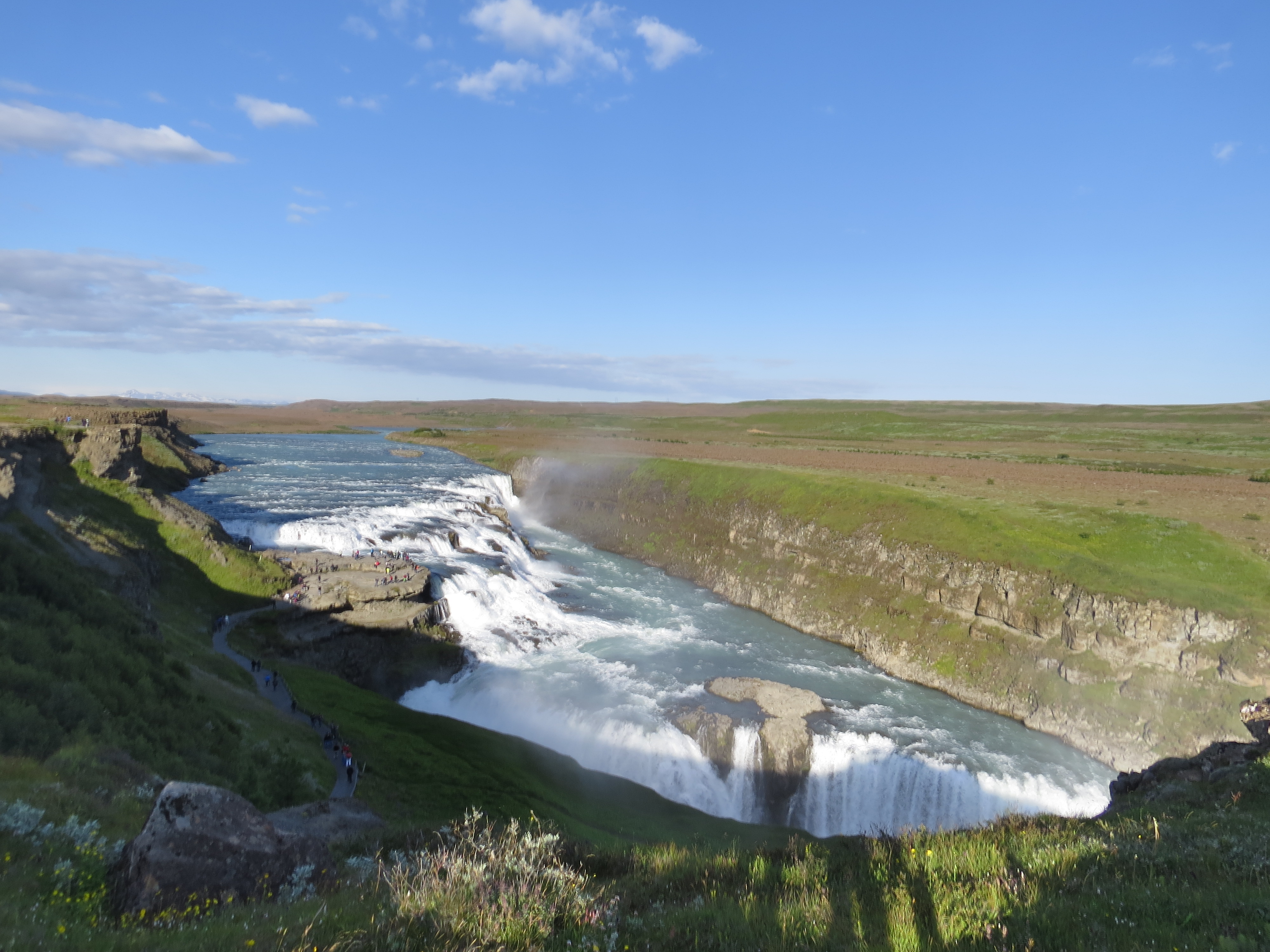 Après un repas tardif sur place direction l'endroit le plus touristique d’Islande: Le Cercle d'or Si vous regardez les infos des stations météos d'Islande (http://www.road.is/travel-info/map-of-w ... ther1.html), il ne faut s'étonner que les températures qu'elles indiques soient souvent basse. Il sont disposées à des endroit très exposé. Celle ci est sur un crête, en plein vent. Sur la route un petit arrêt à Gullfoos, sans doute la cascade la plus connue et "visitée" d'Islande. Vu sur le parking, un sprinter bodybuildé, je veux le même en aménagé Gros contraste entre le matin où nous étions isolés en pleine montage et la fin de journée noyés au milieu de la foule.