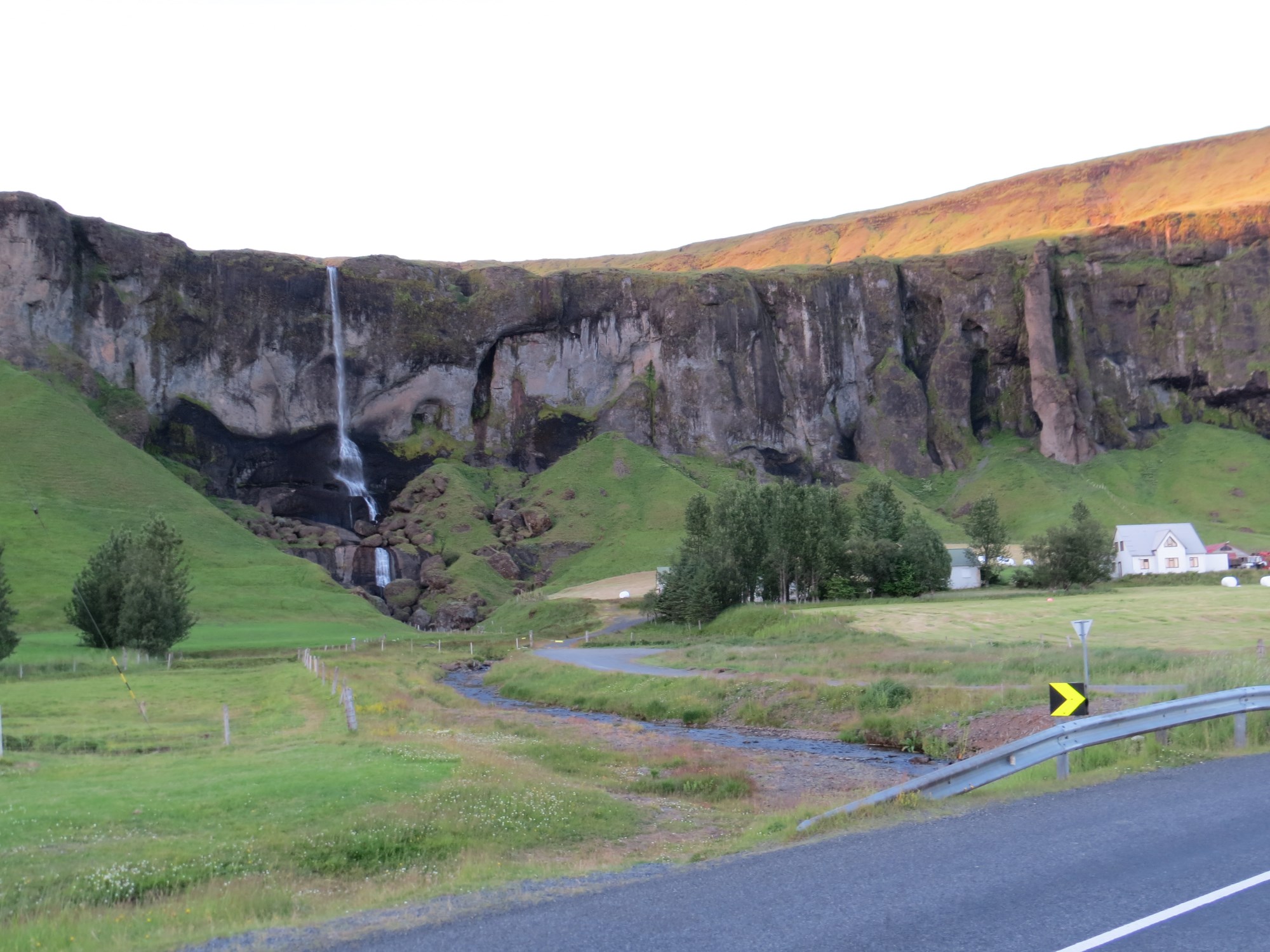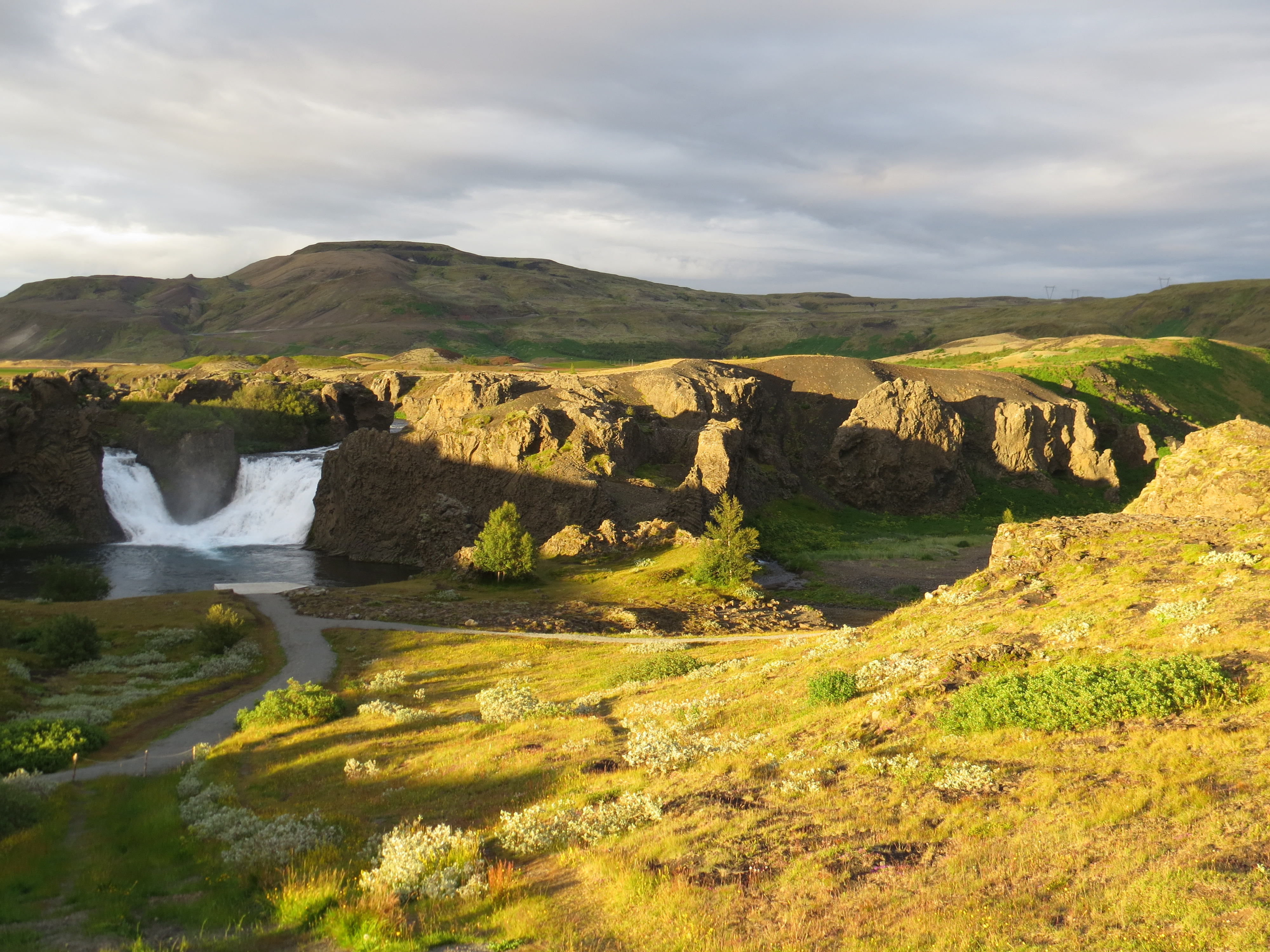 Les enfants se sont régalés dans ces retenues d'eau. Nous en avons aussi profité pleinement. Attention, il vaut mieux y aller le matin ou tard en fin de journée, nous avons croisé pas mal de monde sur notre chemin de retour, dont certains avec des tenues surprenantes. En fin de journée, on se dirige plein Ouest. Notre bivouac sera aux pieds de la double cascade de Hjalparfoss Temps ensoleillé, se couvrant un peu en soirée