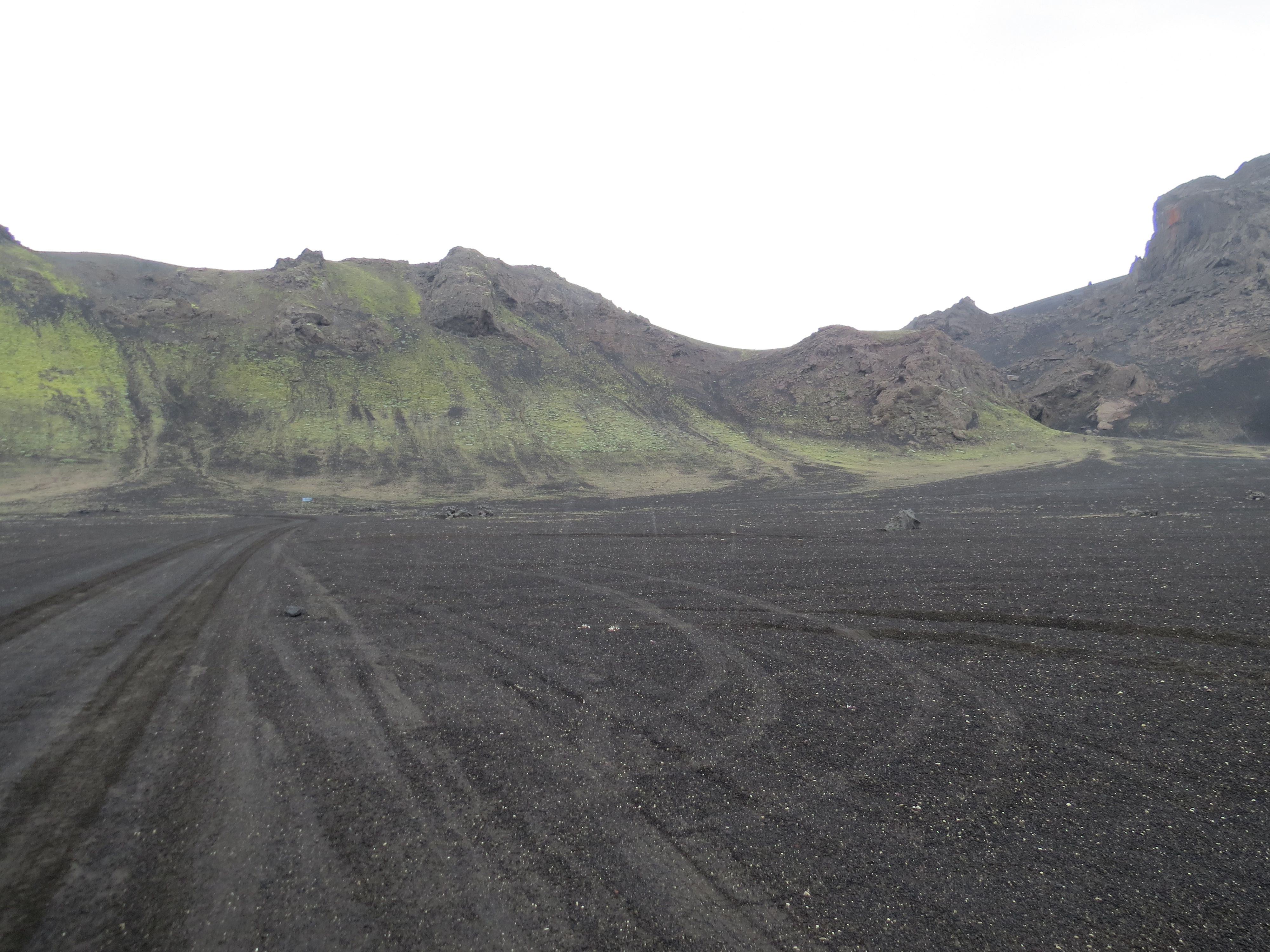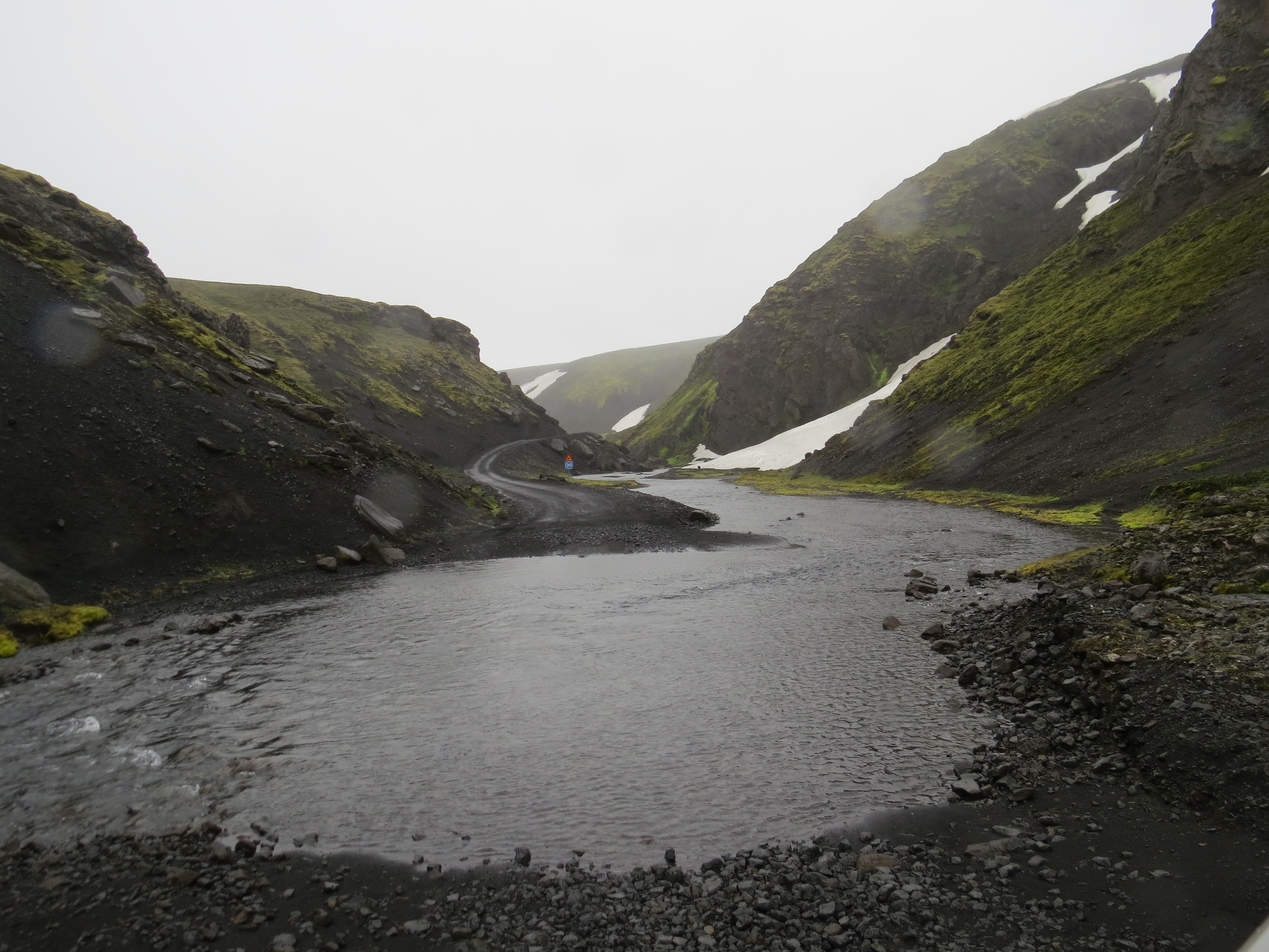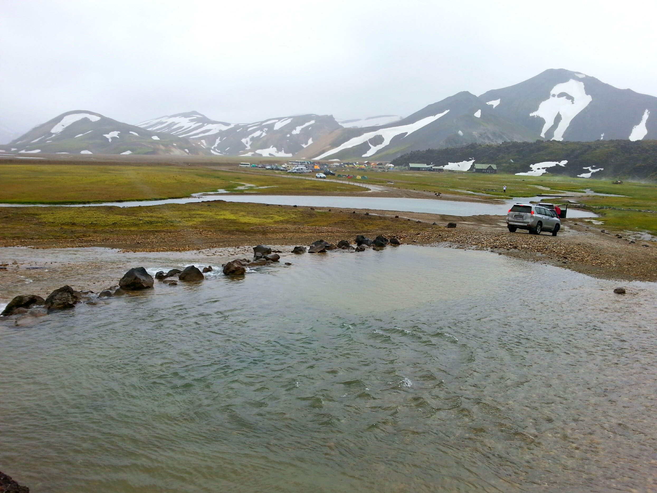 Au début, c'est piste de sable noir Puis, c'est beaucoup plus vert Puis à nouveau sable noir On arrive à Landmannalaugar, c'est camping obligatoire (Parc National) Le gué qui "filtre" le passage de certains véhicules, il se passe tout seul avec notre destrier Obelix On profite des sources chaudes dés notre arrivée, car il semblerait que le temps risque de changer. Temps: couvert le matin, éclaircies en fin de journée.