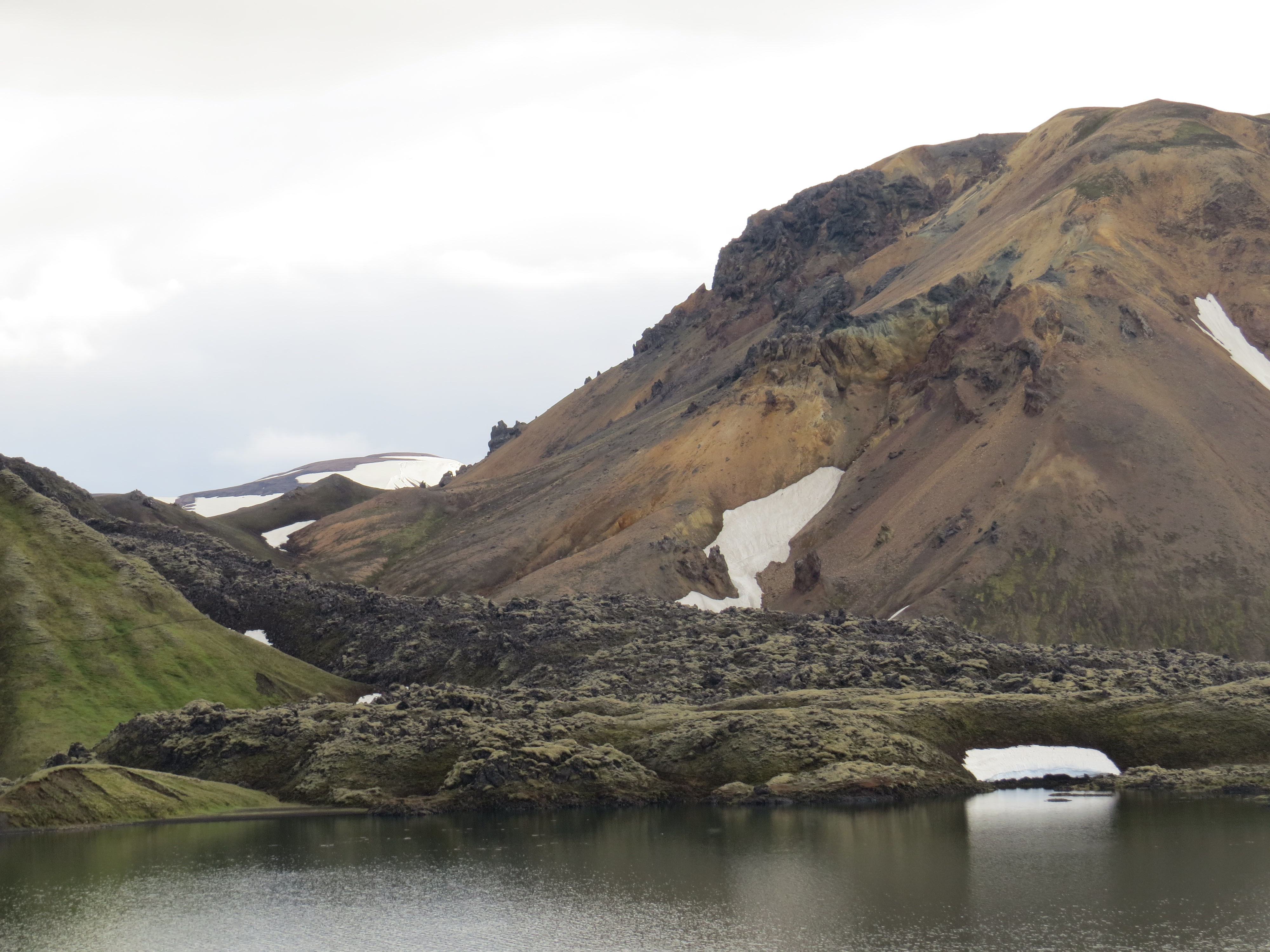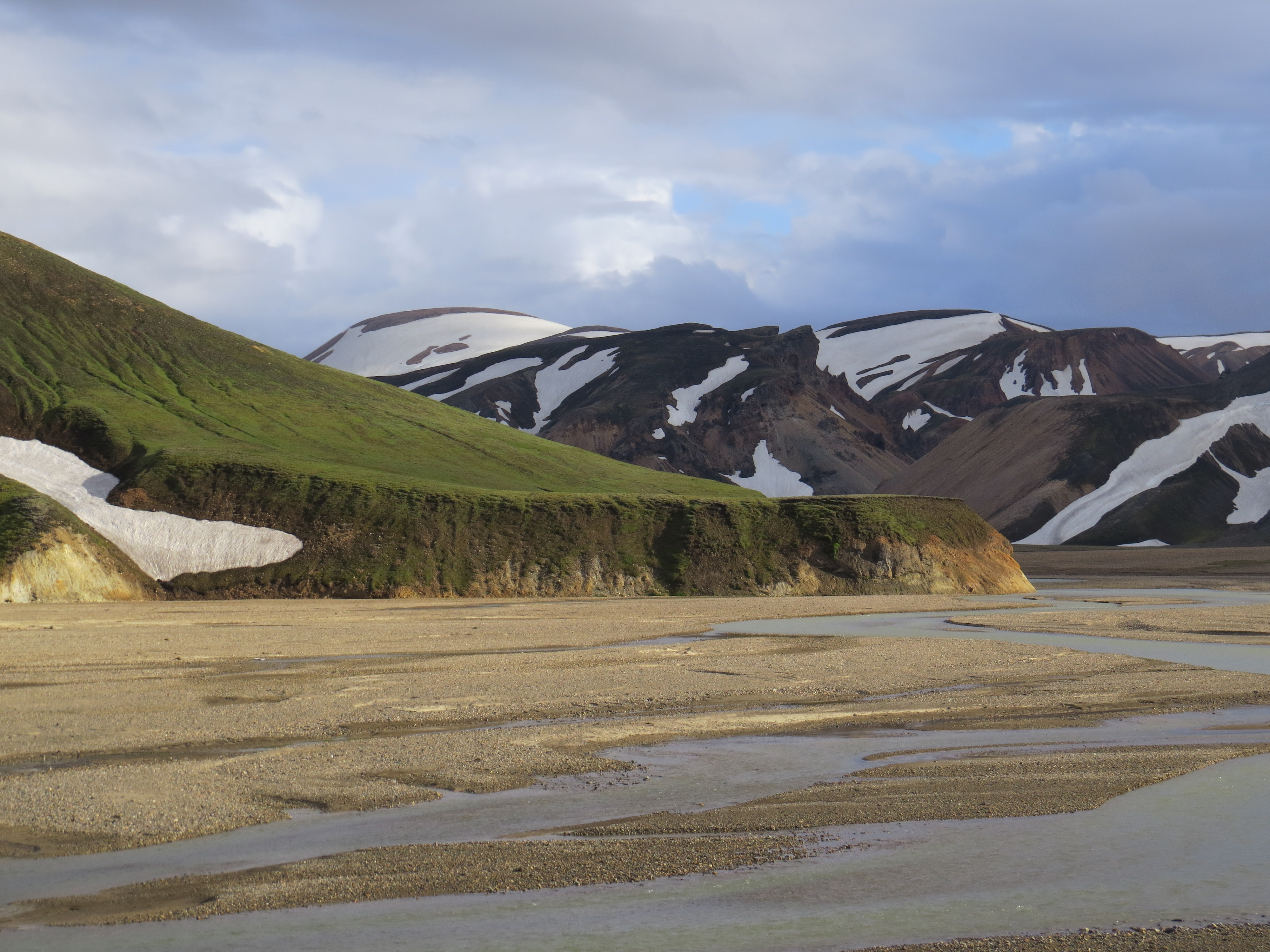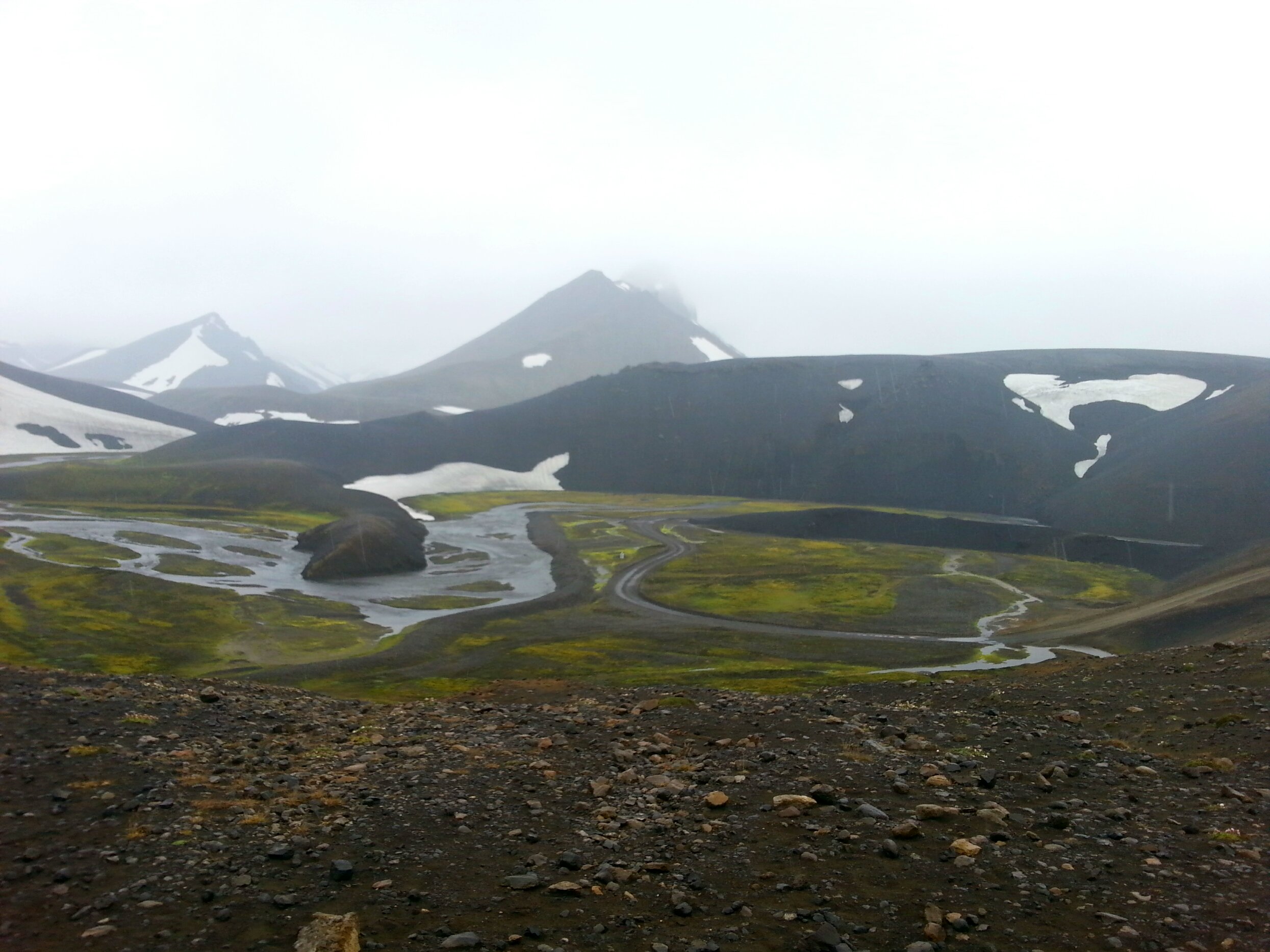 Au début, c'est piste de sable noir Puis, c'est beaucoup plus vert Puis à nouveau sable noir On arrive à Landmannalaugar, c'est camping obligatoire (Parc National) Le gué qui "filtre" le passage de certains véhicules, il se passe tout seul avec notre destrier Obelix On profite des sources chaudes dés notre arrivée, car il semblerait que le temps risque de changer. Temps: couvert le matin, éclaircies en fin de journée.