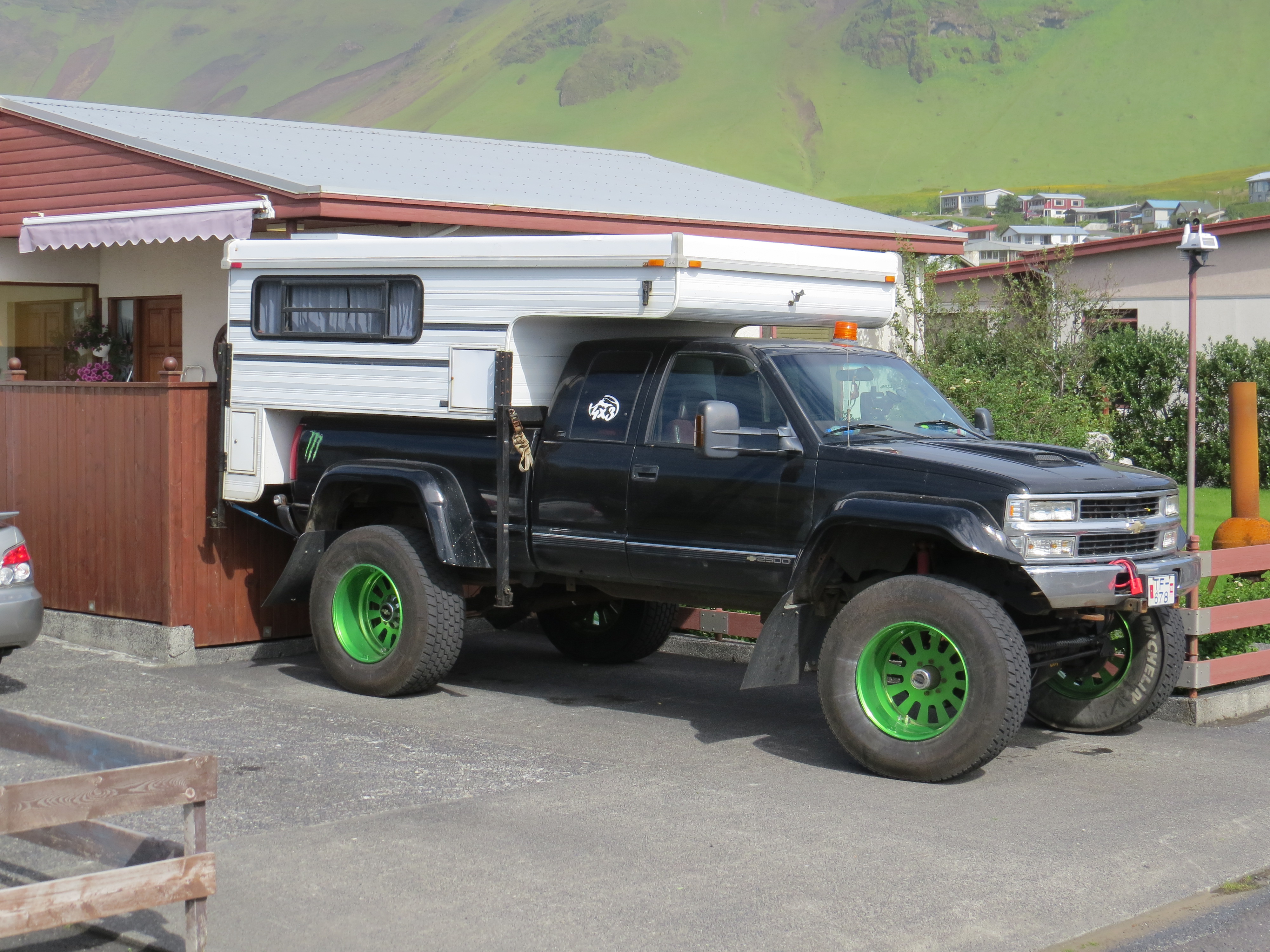 Petit tour du campement avant de partir avec les fameux bus et la cabane du 112 et les nombreuses plaques d'immatriculations perdues. A-t-on retrouvé les voitures qui allaient avec ??????? Frustré de ne pouvoir faire notre ballade vers un lac, nous décidons d'y aller de manière véhiculé avec notre B. Le temps est exécrable, vent et pluie, mais on croise tout de même des randonneurs. J'avoue, j'ai du mal à comprendre le plaisir de marcher par ce temps....... Puis direction plein sud par la F208. Le temps reste pluvieux et bouché. Ça sera la seule "déception" du séjour, sachant que cette piste est réputée pour sa beauté et ses paysages. Nous arrivons à Vik, sur la cote Sud de l'Islande, le temps est toujours maussade. Par sécurité, et pour "profiter" d'un lave linge, on choisi l'option camping.