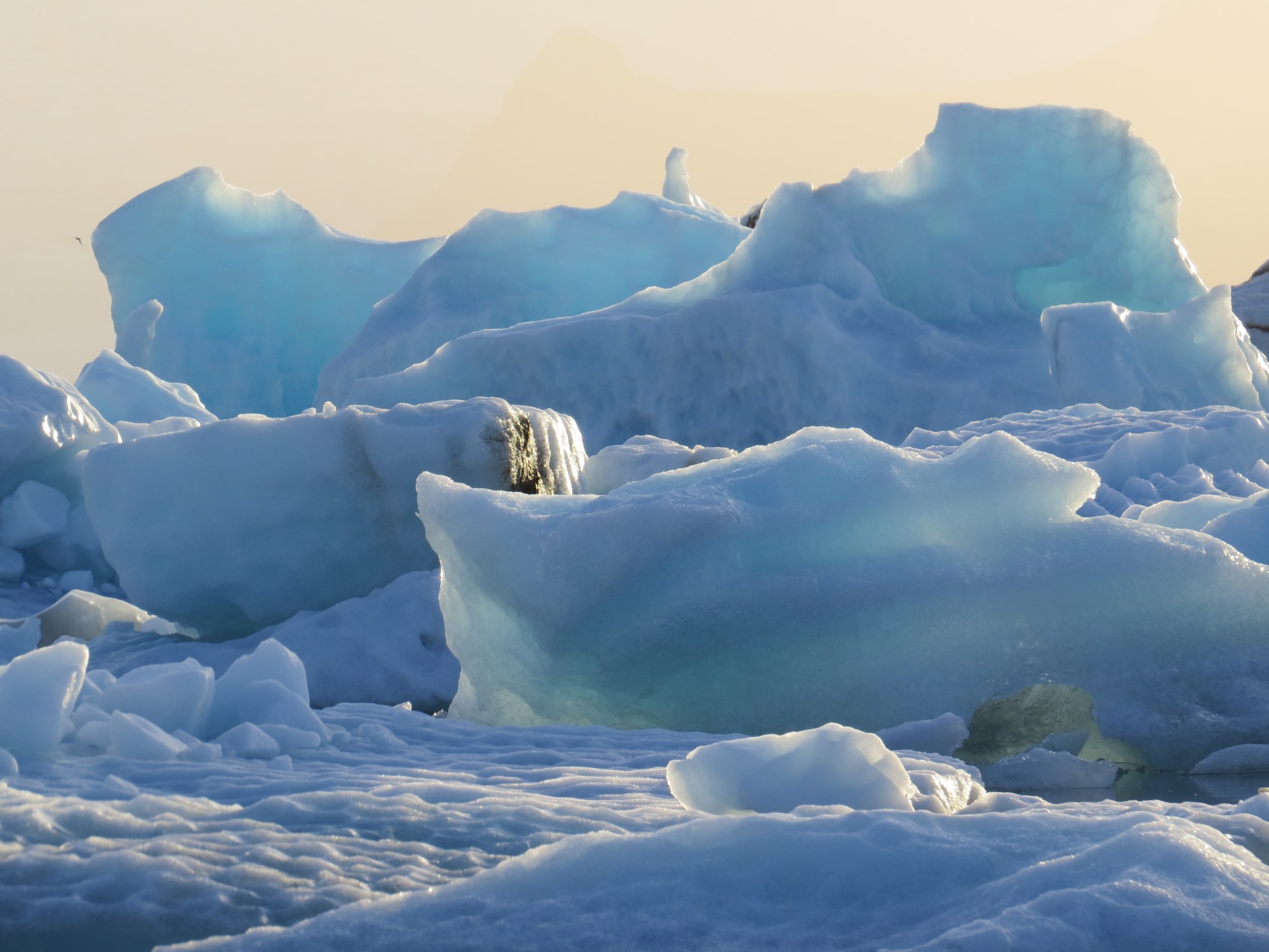 En chemin, on fait un petit stop à Hof afin de voir une des dernière église en tourbe d'Islande. Avant d'arriver à la lagune, on s’arrête à une autre lagune glacière, celle de Fjallsárlón , jolie, sympathique, moins touristique, mais Jokulsarlon est tout de mène beaucoup intéressante et spectaculaire. Quelques kilomètres plus loin, on arrive à la lagune glacière de Jokulsarlon et là le spectacle est grandiose. On peut rester des heures à se balader le long de la berge. Inutile de prendre les bateaux pour aller sur l'eau. On y restera jusqu'au couché du soleil afin en profiter. L'endroit est paisible, reposant, surtout en fin de journée, quand les cars de touristes sont rentrés à Reykjavík. On traversera la route pour bivouaquer sur la plage Temps: Tempête de ciel bleu