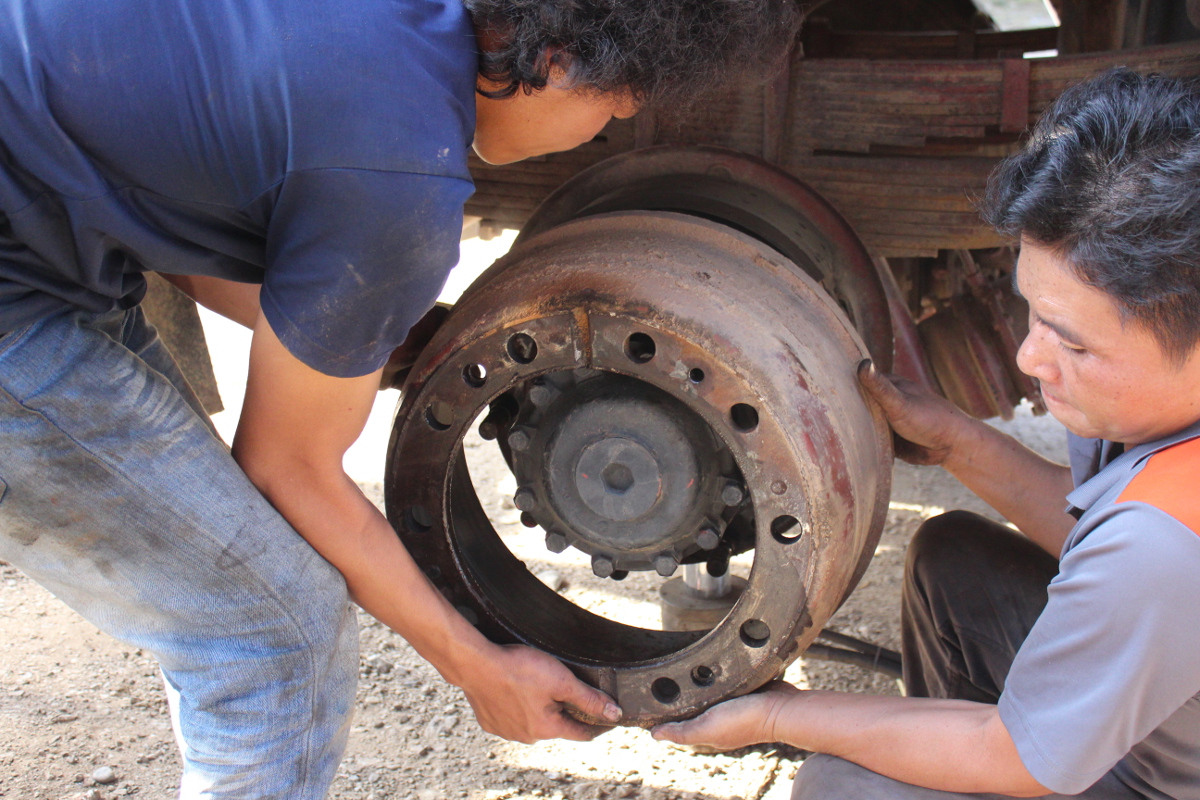 A cela s'ajoute qu'une des vis, qui ne sont plus tenues par un boulon, s'est enfoncé avec les vibrations au Laos et se trouve maintenant à l'intérieur du tambour de frein !!! Au début, cela a bloqué la roue, puis après une petite marche arrière elle ne nous a plus posé de problème. Il reste qu'elle se ballade toujours là-bas dedans avec la crainte de bloquer la roue en roulant, voir de péter quelque chose.