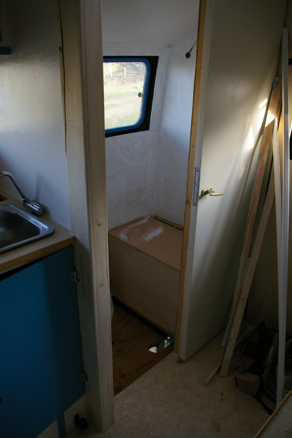Tout il est fini sauf la salle de bain qui attend que je reçoive les éléments de la toilette sèche et le réservoir d'eau usées. Pour l'instant le coin toilette ça donne ça: