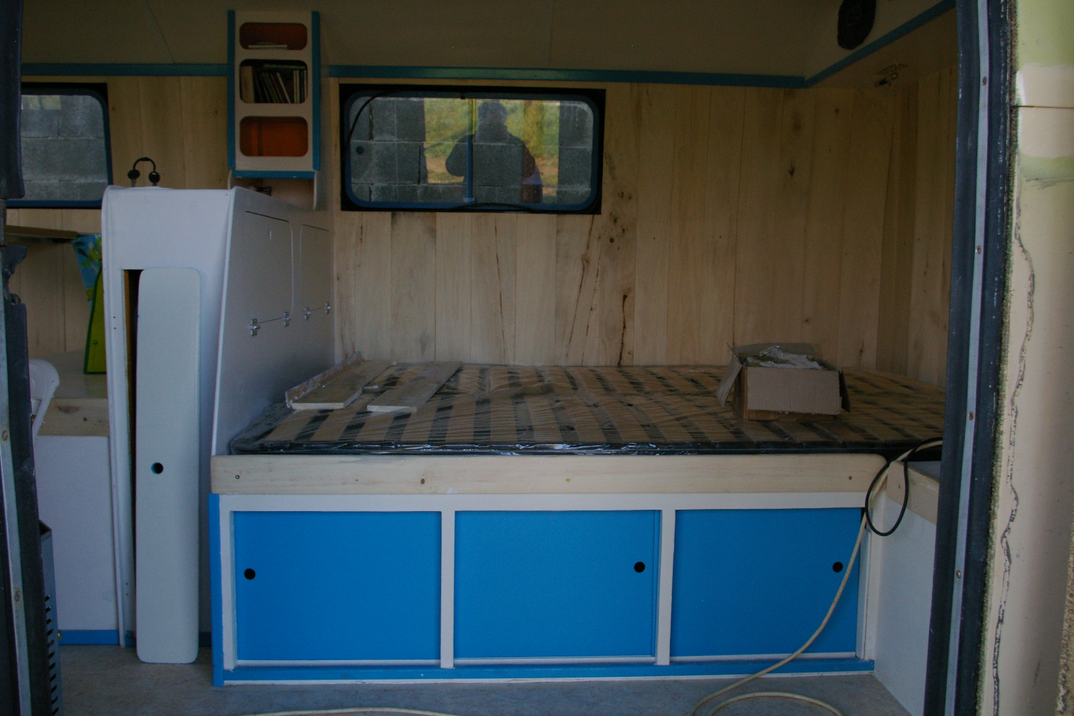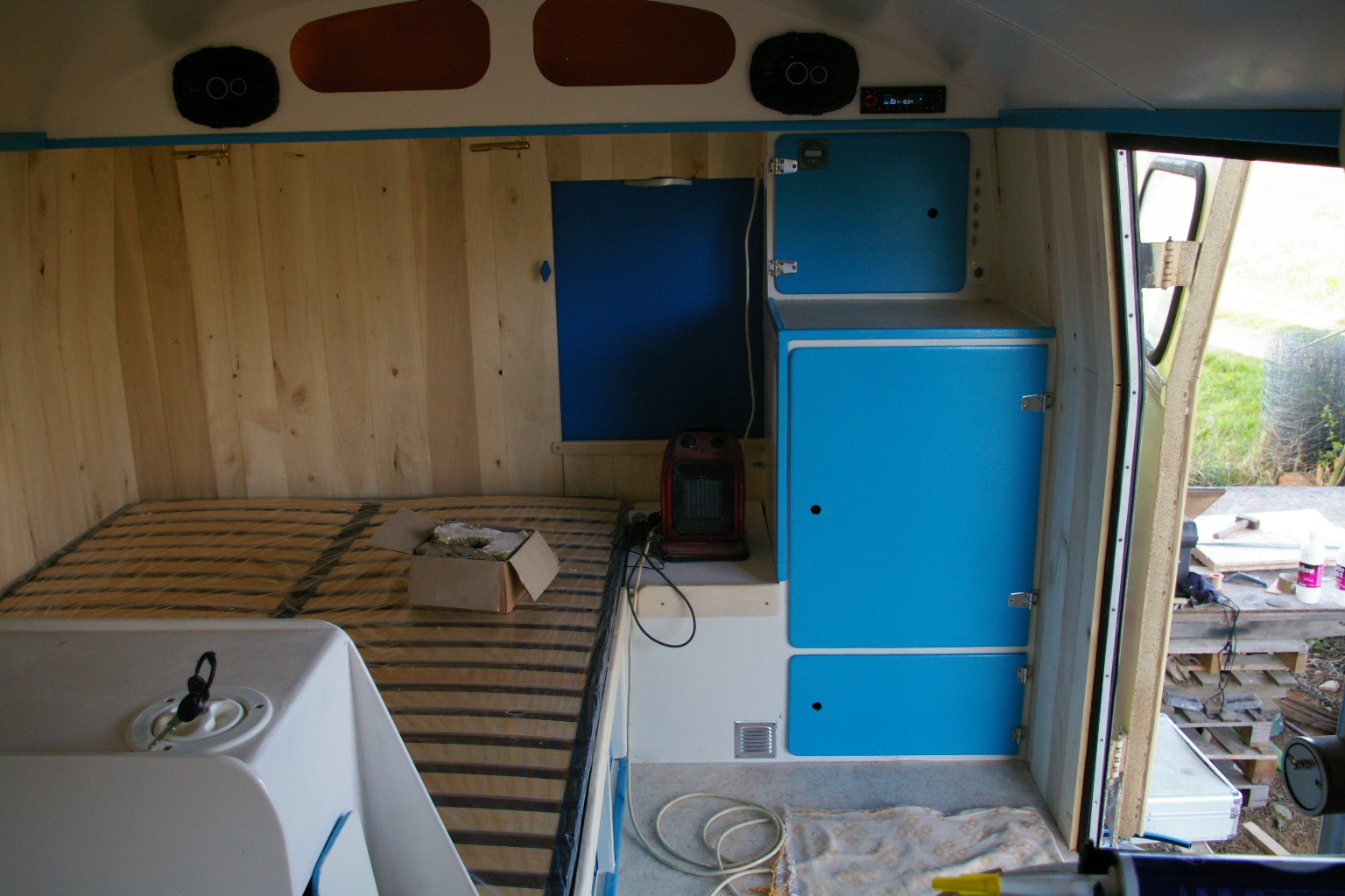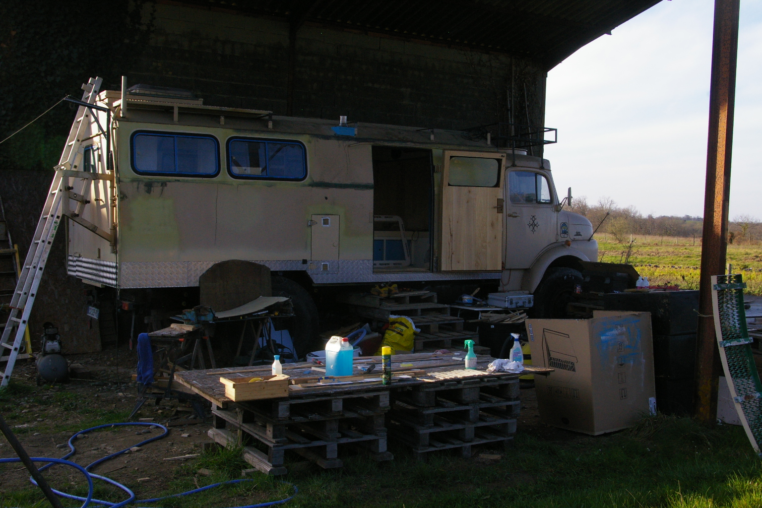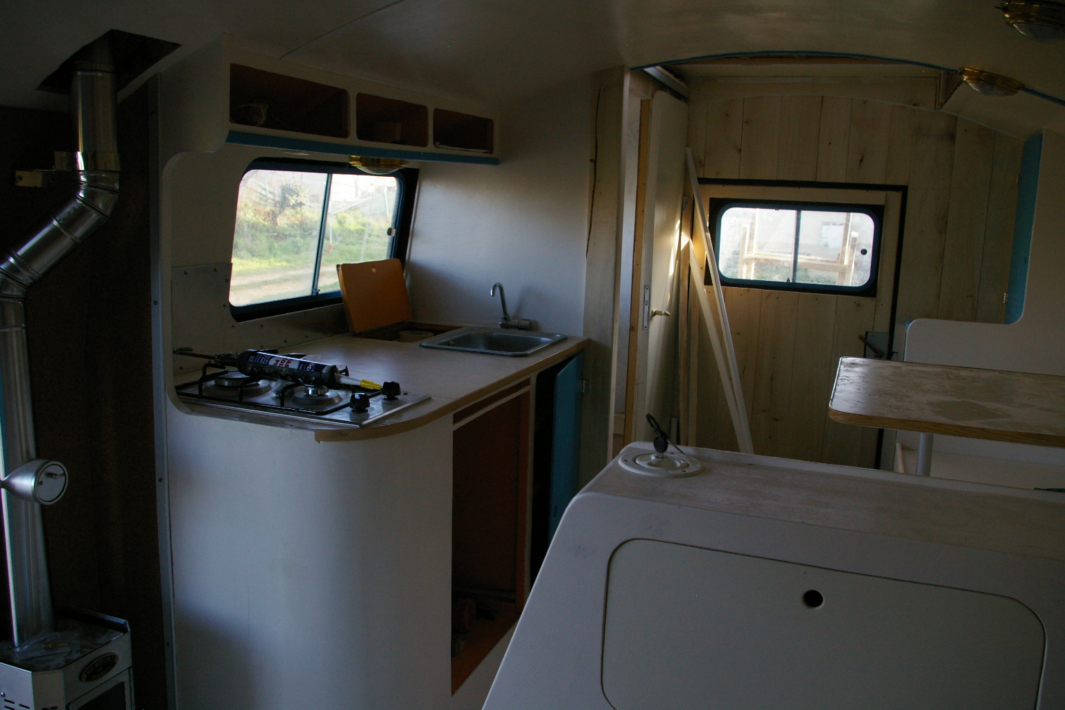 Et une petite réflexion sur l'isolation et le chauffage au passage. Ce poêle (et il en est de même pour tout autre système) même au ralenti fait sérieusement monter la température. C'est vrai qu'il ne fait pas froid ICI mais quand même au bout d'une demi heure c'est trop, et il faut ouvrir les fenêtres. Donc ma petite déduction serait qu'il est beaucoup plus important de réfléchir le système de ventilation que l'isolation. Même si bien-sûr elle n'est pas à négliger. Cela a été dit ailleurs, tout chauffage réchauffera une cellule quelle que soit son niveau d'isolation. par contre une aération mal calculée peut être négative pour notre confort et notre santé sans oublier les dégâts sur le camion.