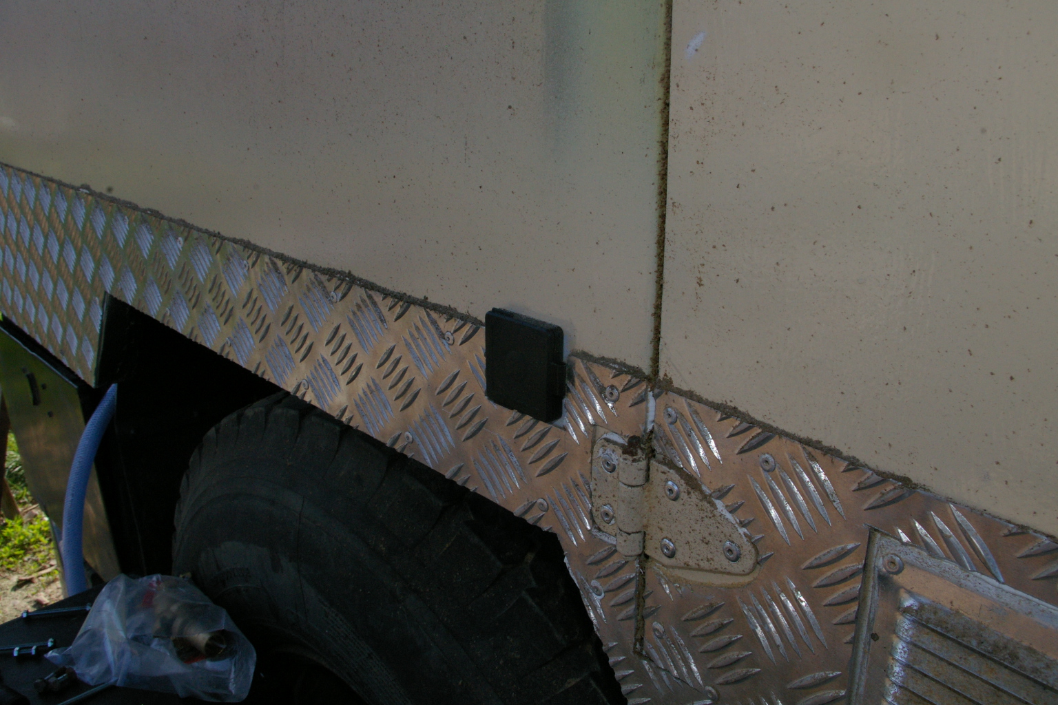 Tout le lieu est étanche donc peinture époxy en deux couches et résine par dessus. Comme l'on va se doucher avec un pulvérisateur de jardin il y aura peu de projections. Voici l'orifice de remplissage des bouteilles de gaz gpl et l'emplacement fini.
