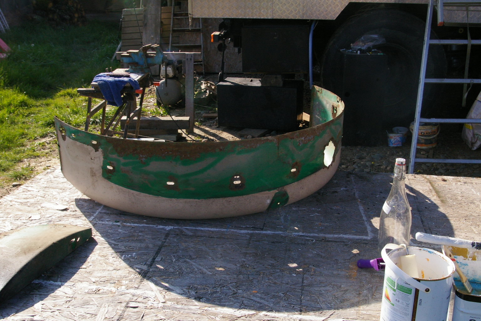 Fini donc le travail au chaud et dans une certaine propreté. J'ai commencé la cabine. Le gros morceau est la réfection des ailes qui sont bien touchées ainsi que le capot qui mérite un bon grattage pour éviter que les quelques points de rouille n'aillent plus loin.