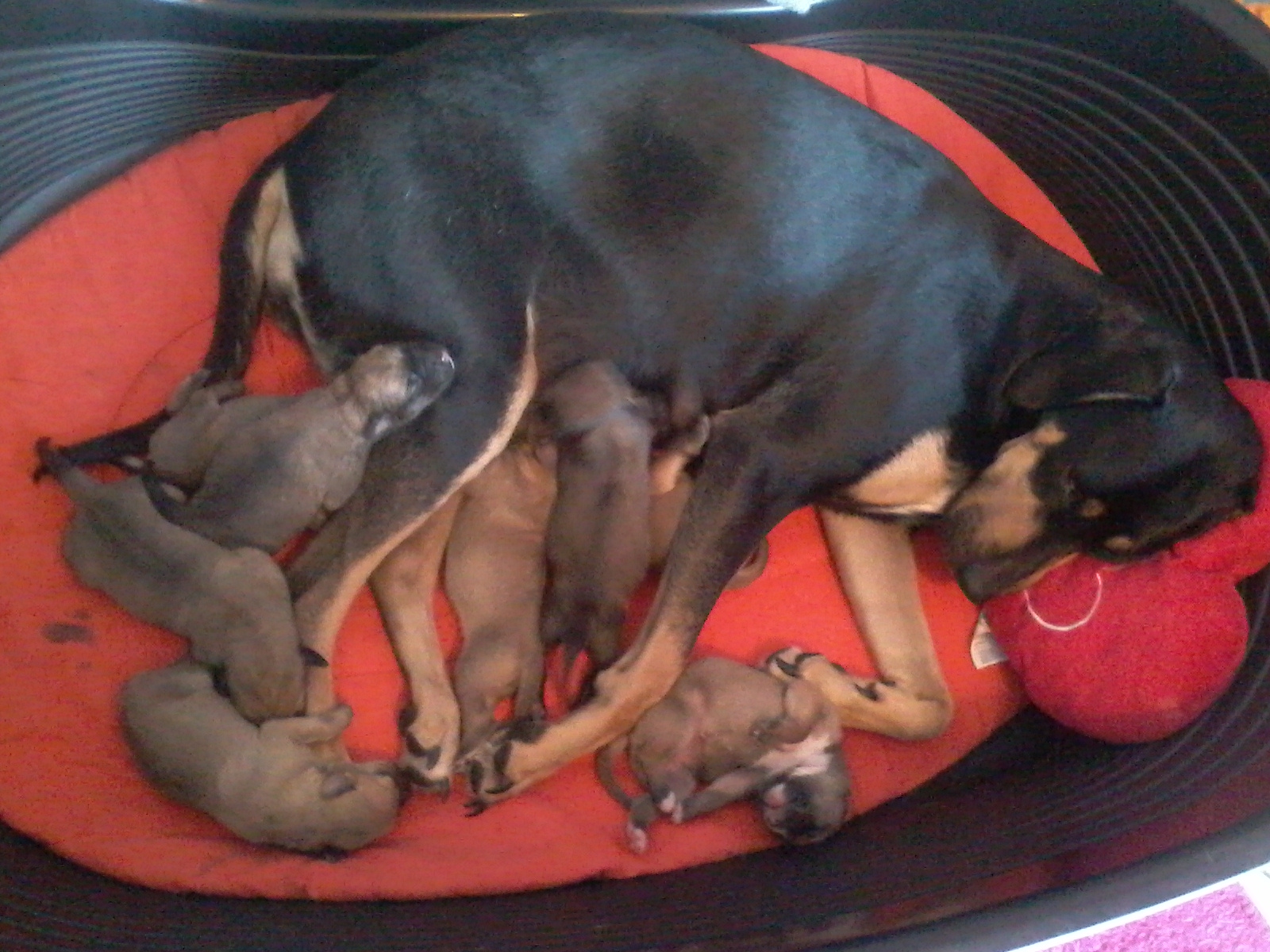 Ma chérie était rester a la maison surveiller Ti'piment ma chienne, qui m'a attendus pour mettre bas et à fait huit jolie chiots ( je pense 5 mâles et 3 femelles) fouet