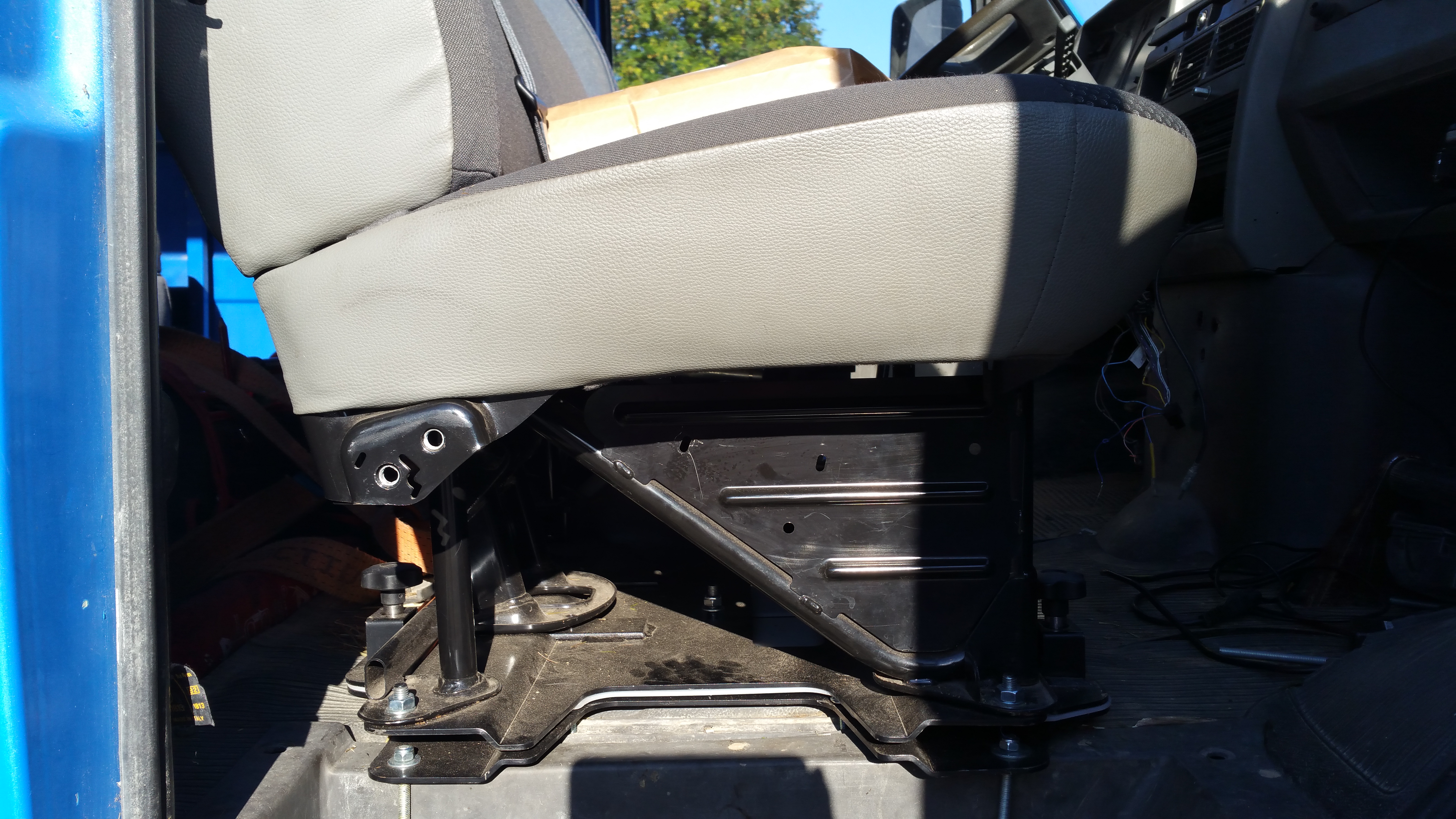 le cam ne vous sera pas inconnu, c'était celui de gil (06)... plutôt typé rando, on cherche a le rendre "grand voyageur". Mais pas évident de caser 5 pers. dans un châssis court non rehaussé.ça fume pour l'aménagement. mais ce coté compact fait aussi sa force... et on a déjà quelques pistes (même si on ne prétend pas réinventer l'eau tiède!). par exemple on vient de basculer une place arrière sur l'avant. Avec une banquette 2 places arrières au lieu de 3, on gagne un peu en "espace de vie"; et on a mis une banquette 2 places avant de trafic avec embase tournante pour le coin repas. reste a faire la même chose avec le fauteuil conducteur.