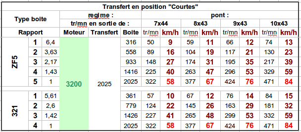 En regardant les tableaux qu'avait fournis Fabien : on voit qu'avec un pont en 7/44, des pneus en 9.00x16 pour 3200 tr/mn, on obtient une vitesse de 58 km/h en courtes !Cubitus a écrit :Fabien : avec les ponts 7x44 je tirais beaucoup trop court. Là, pour le coup il montait bien dans les tours, mais à 60-65 j'étais haut dans les tours, en 5ème (OD).