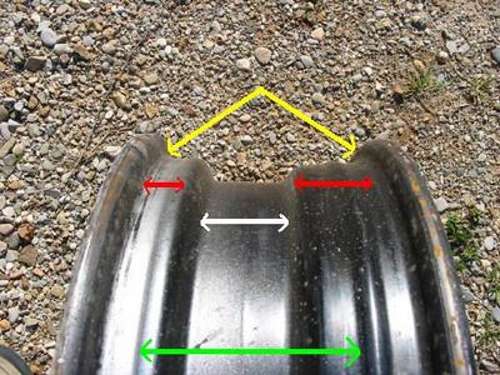 Les flèches rouges correspondent aux talons de la jante et comme vous pouvez le constater, il y a deux largeurs de talon. Le moins large correspond toujours au coté extérieur de la jante , celui où se trouve la valve.