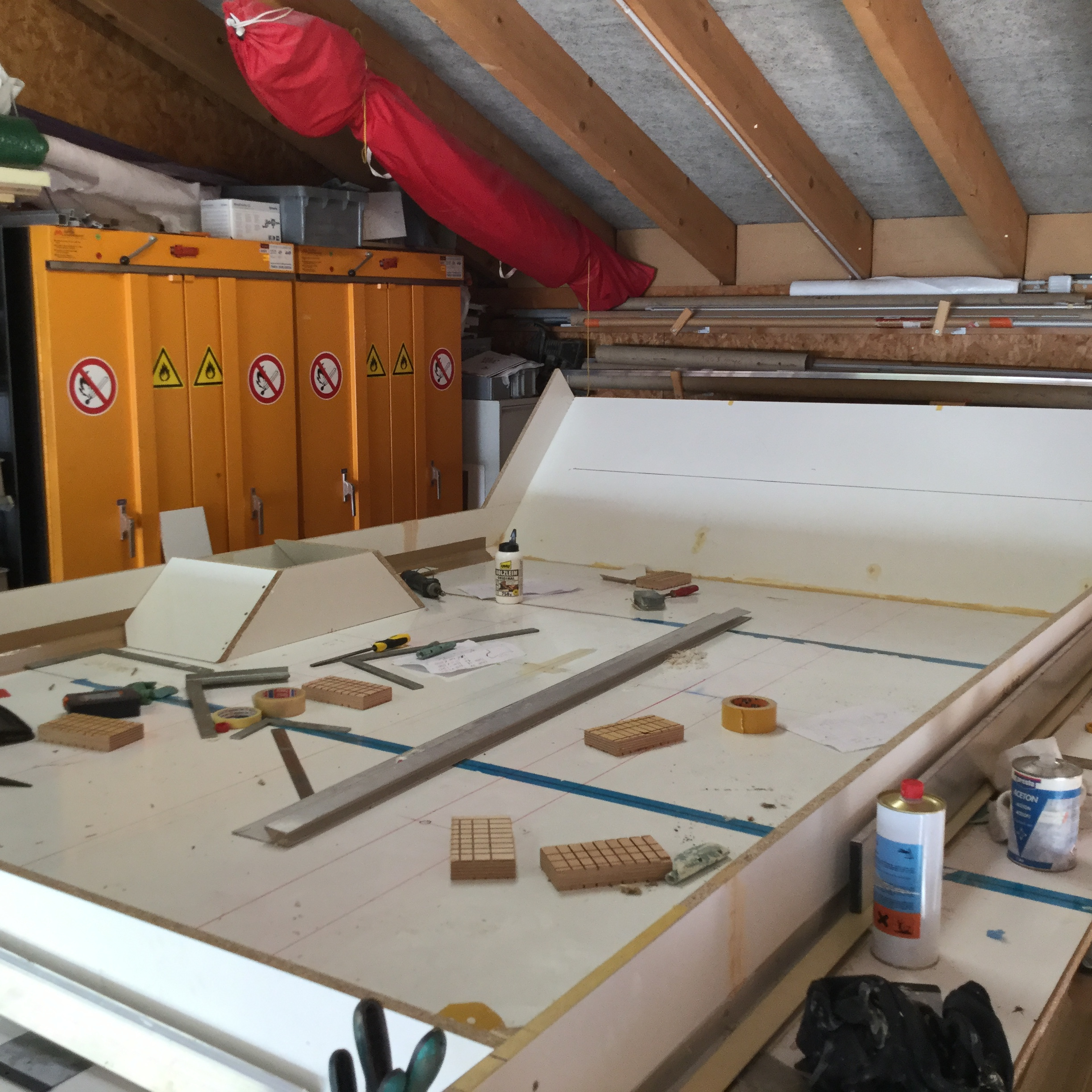 mise en place de l aménagement en gabarits nid d abeille puis assemblage en préfabriquer des différents modules en panneaux composites.