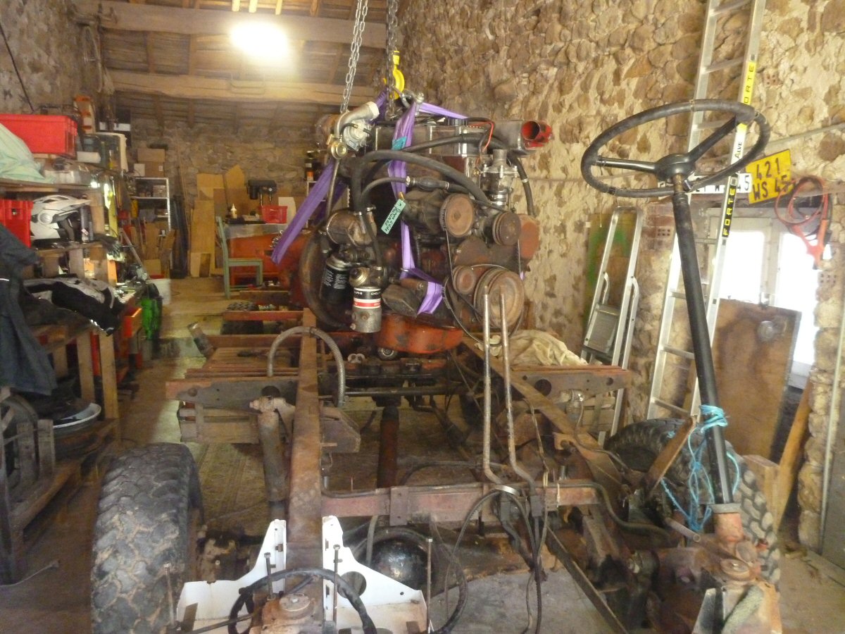 Dépose du moteur: Dépose du moteur Essence de Pagong: Puis intégration dans la caisse: Nouveau support moteur ... nouvelle boite de transfert ... nouveau pont ... nouveau levier de vitesse ... nouvelle commande de BT ... nouveau radiateur ... nouveau filtre à air. Création des nouveaux capots pour laisser passer la sortie d'échappement et le nouveau radiateur du trm 4000: Bon voilà à peu prèt ou l'on en est ...