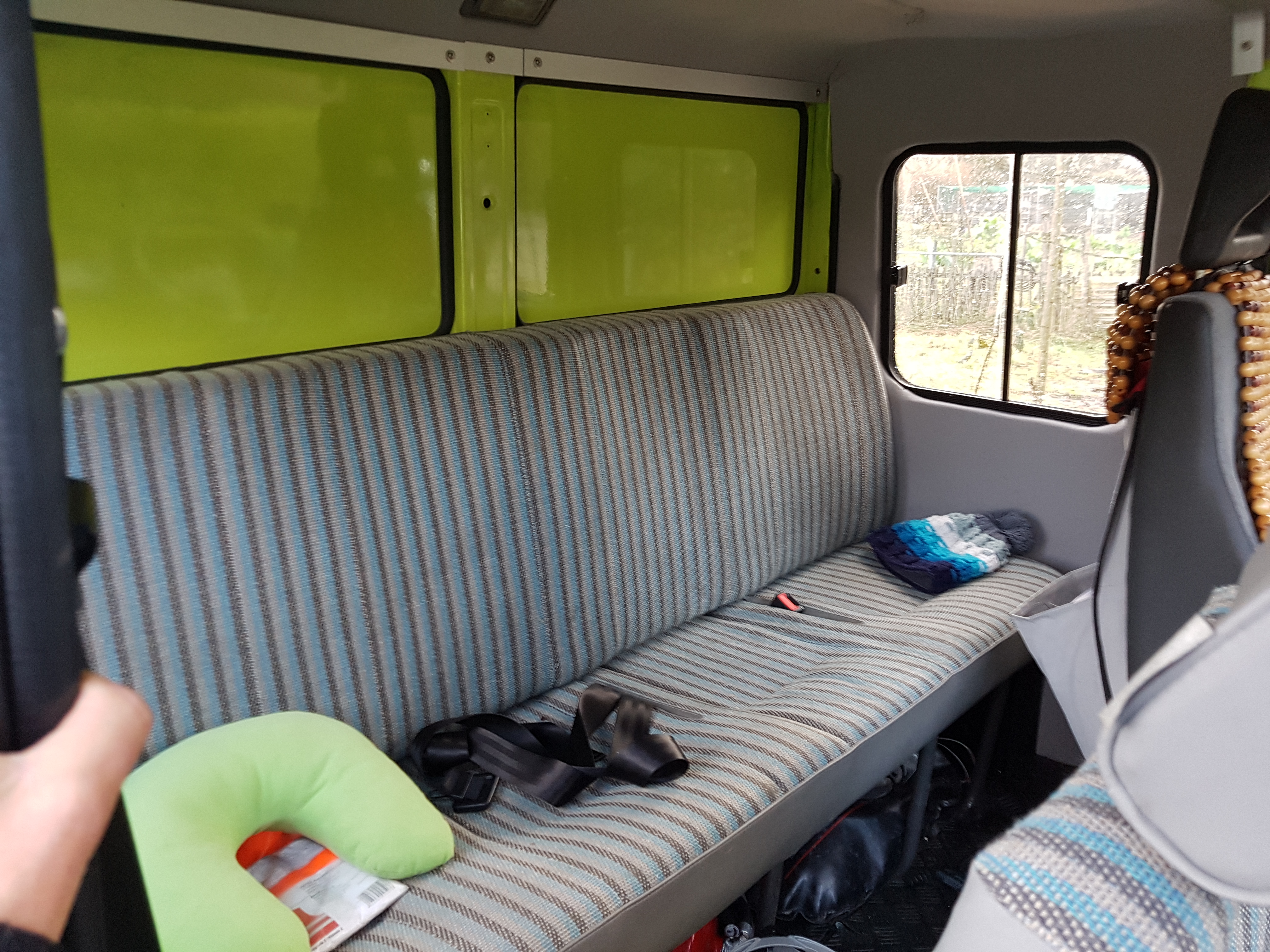 Le vendeur m' a donné avec une banquette d'origine 4 places que j'ai installé à la place des rangements, est j'ai trouvé d'occasion deux sièges suspendus pour les place avants, donc au contrôle technique je pensai avoir 6 places, mais pour une question de poids sur l'essieu avant je n'en ai que 5 homologuées ce qui me va trés bien aussi.