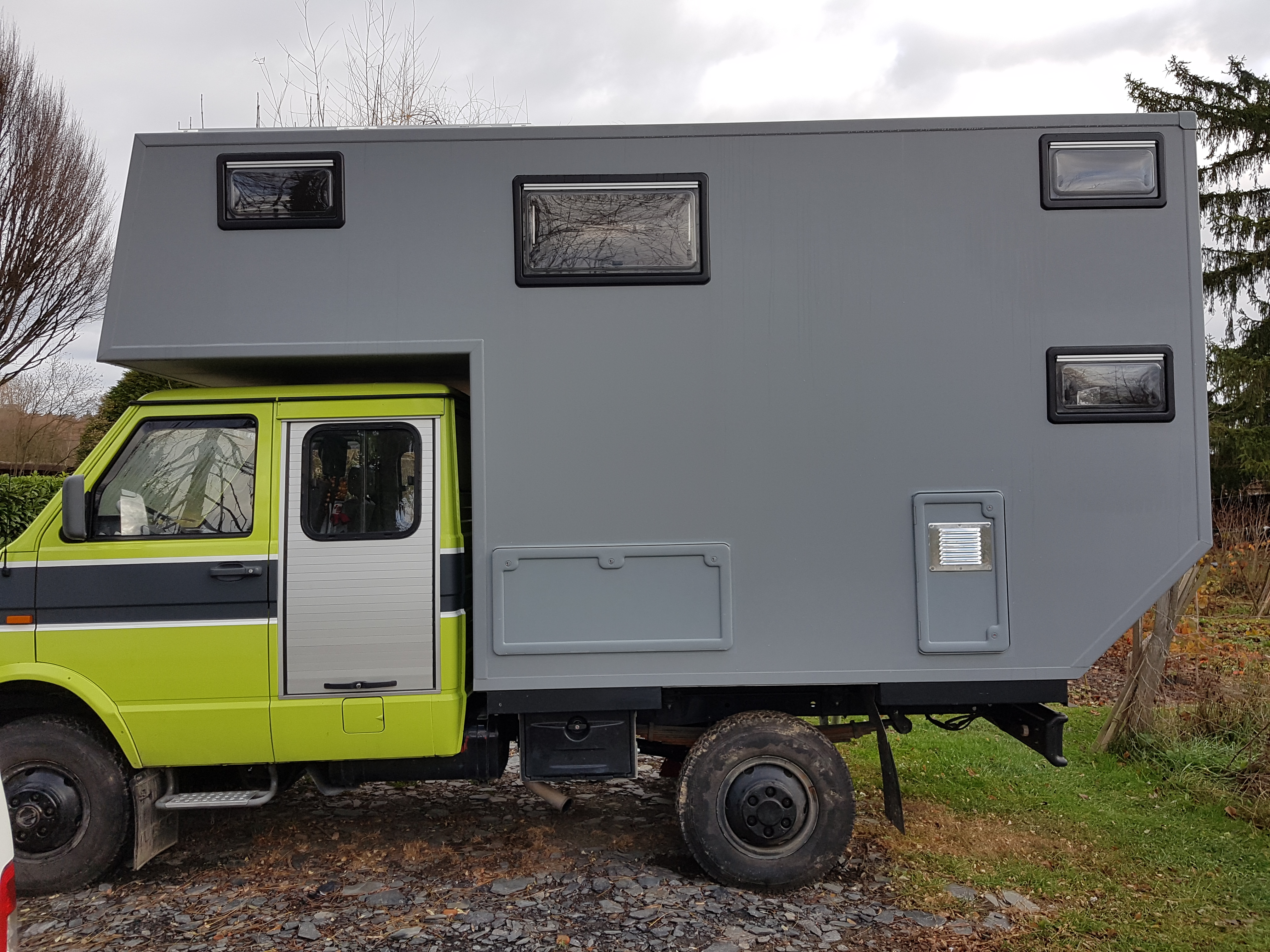 J'ai dessiné la cellule selon ce que j'avais envie est besoin, c'est un mix de mes différents camping car, est je l'ai fait fabriqué chez IPM MONDIA avec pour seul ouverture la porte, car pour le reste il peuvent aussi le faire, mais cela chiffre très vite... elle m'est revenue au environ de 10'000 € HT avec la peinture extérieure.