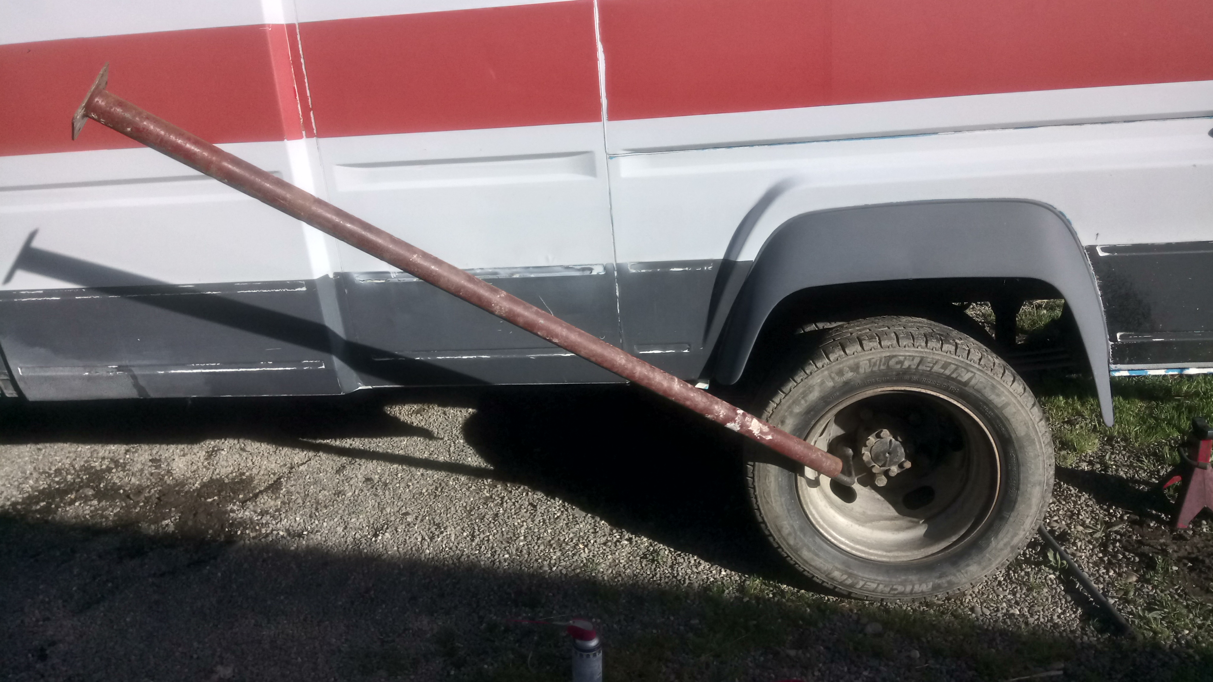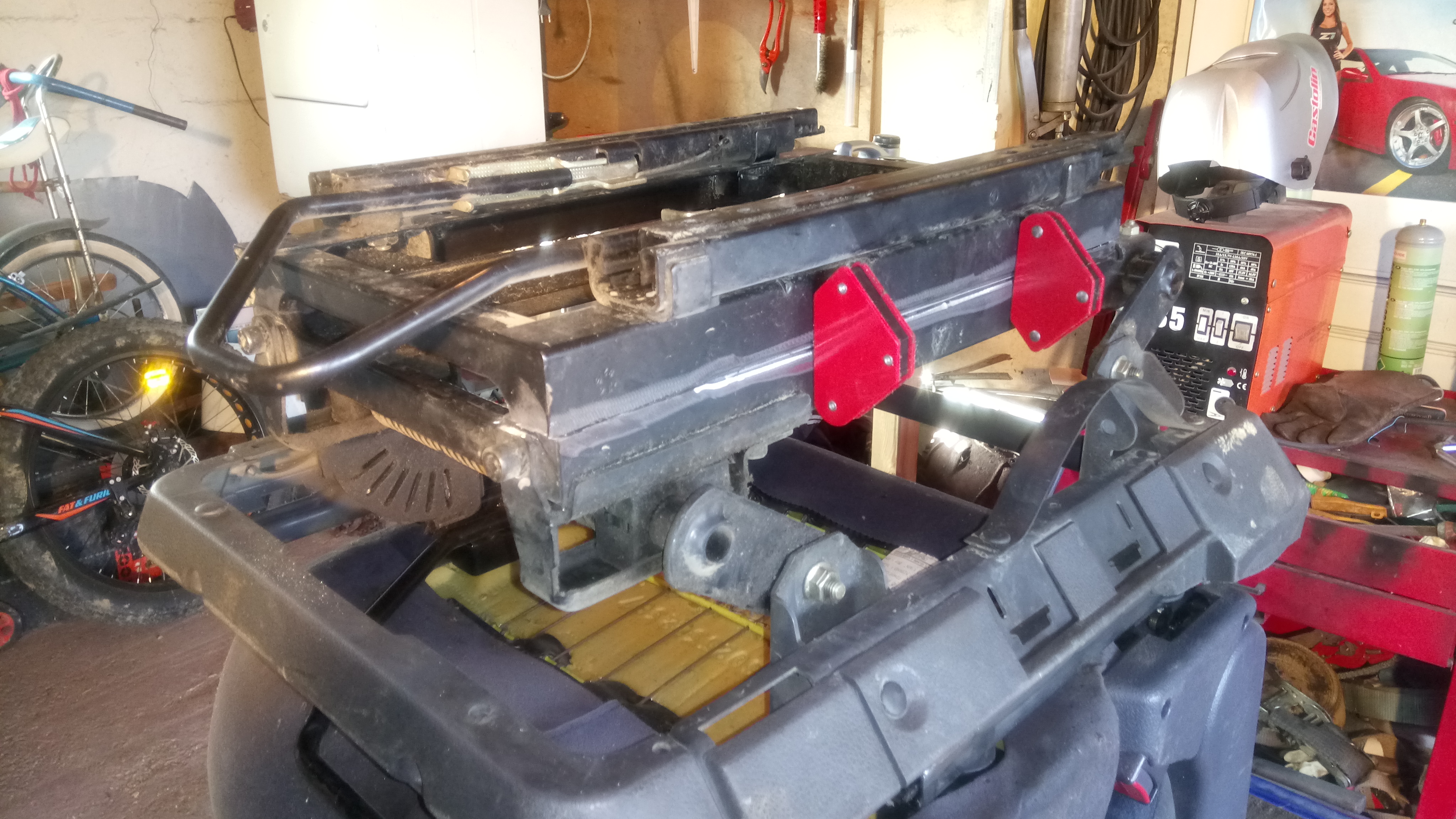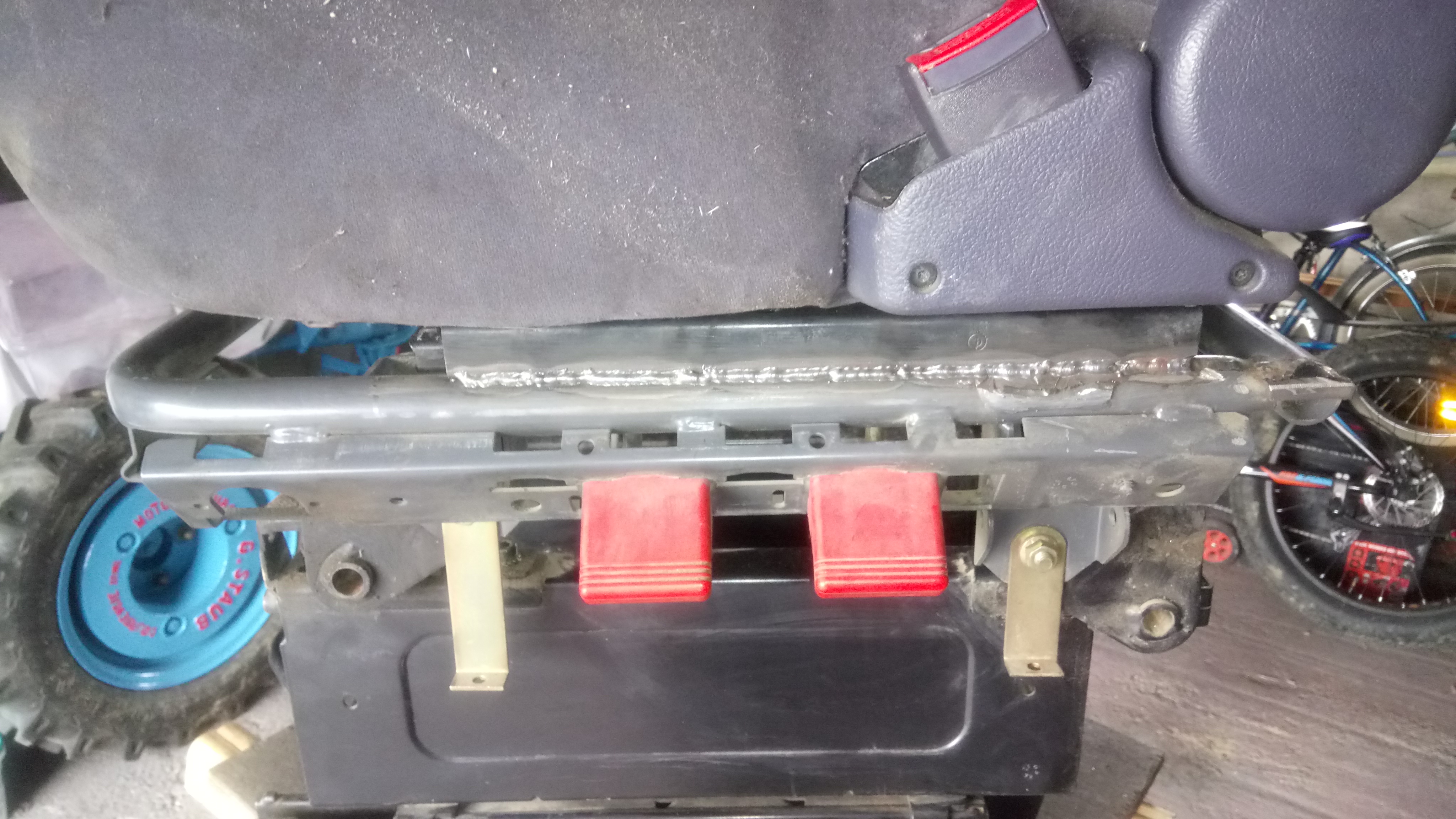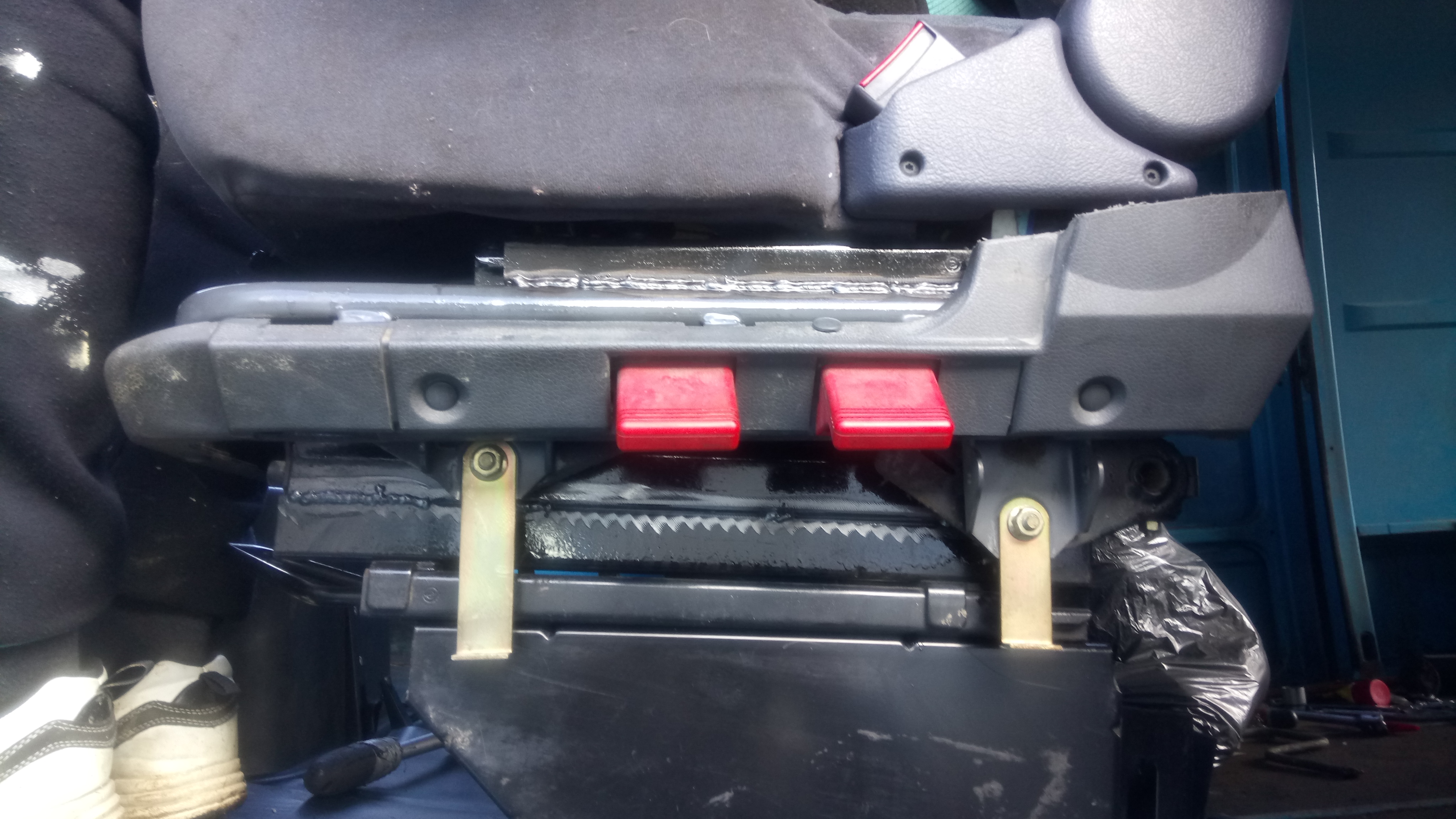 allez, je me suis attaqué au siège chauffeur entre deux averses... Et après ça et avoir monter mes roues avec pneus neufs à l'avant, je me suis attaqué aux freins arrière... et l'arrière droit bloque. Il est tard on verra demain, mais ça risque d'être sport ! J’espère que le tambour va venir sans embarquer les mâchoires.