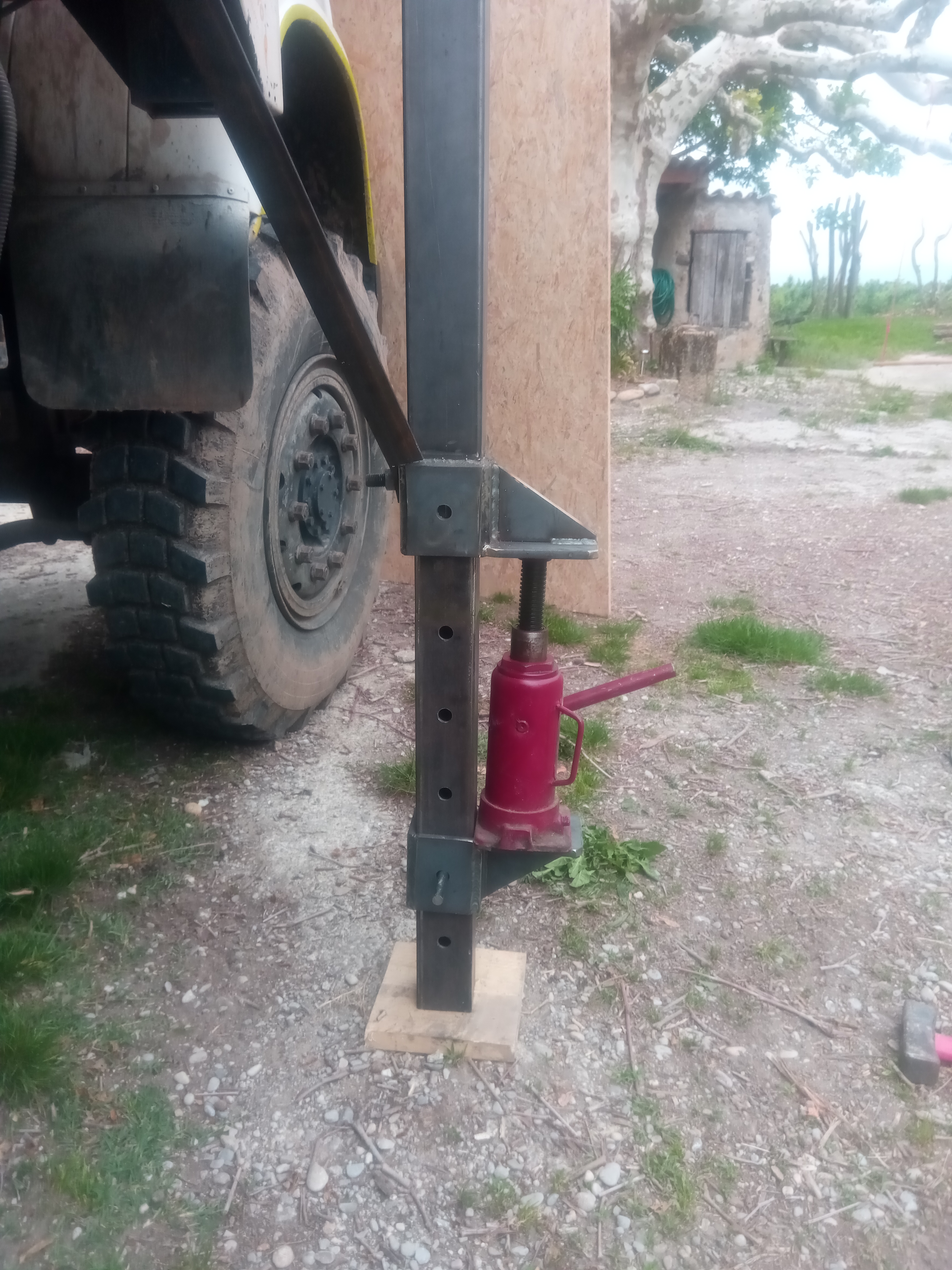 J'ai donc demandé à un ami de me fabriquer des béquilles qui ce fixent au 4 coins de la caisse.