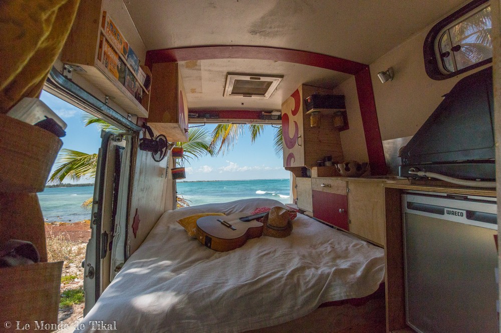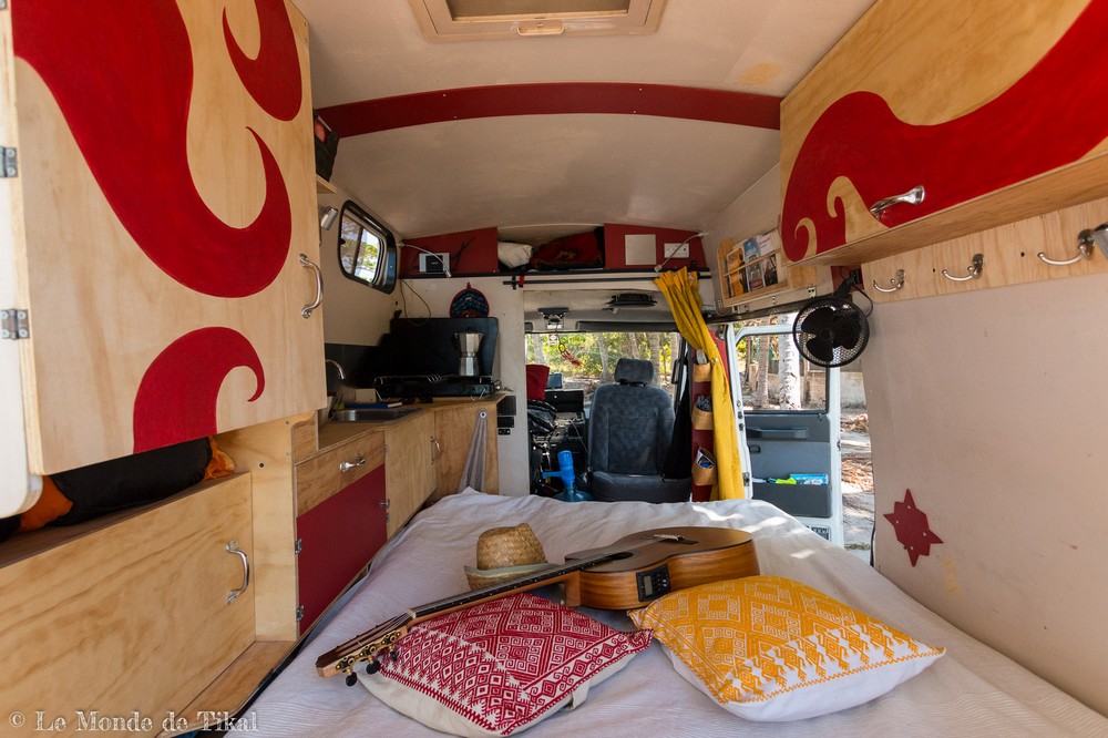 Pour la petite histoire, nous l'avons aménagé nous-même une première fois pendant un an, en France. Nous l'avons ensuite envoyé au Canada, puis après 6 mois sur les routes de la panaméricaine, nous nous sommes décidés de tout démonter pour refaire entièrement l'aménagement. On s'est arrêté à Oaxaca, au Mexique, pendant un mois complet, et on a tout refait !